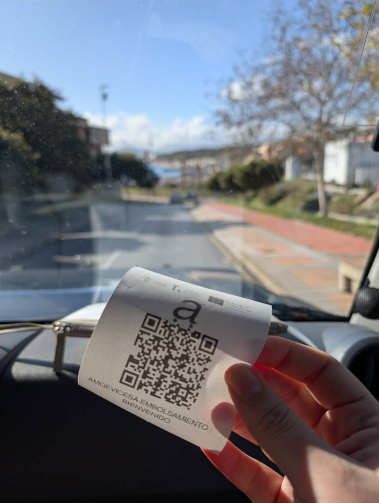 Toen we aan kwamen rijden werden we direct weer weggestuurd, we moesten eerst een ticket halen bij de parkeerplaats bij het ziekenhuis (gratis en 5 minuten rijden van de grens). Op dit ticket staat een QR-code waarbij je zou kunnen zien wat de actuele wachttijd is. Dit hebben ze bedacht om eventuele drukte tegen te gaan. Vrij onnodig in ons geval want de wachttijd was minder dan 5 min. Aan de Spaanse kant rij je naar het hokje, je blijft in je auto en laat je paspoort zien. Na 2 minuten mag je weer verder rijden.