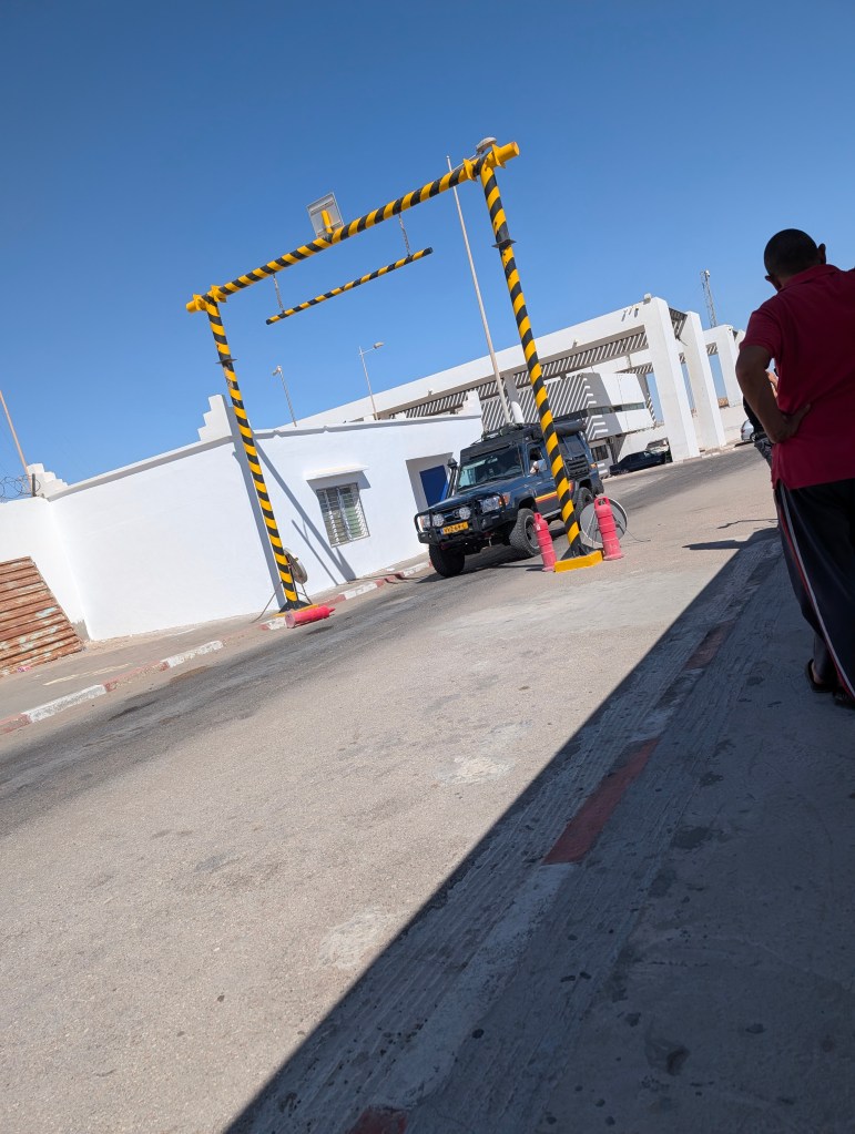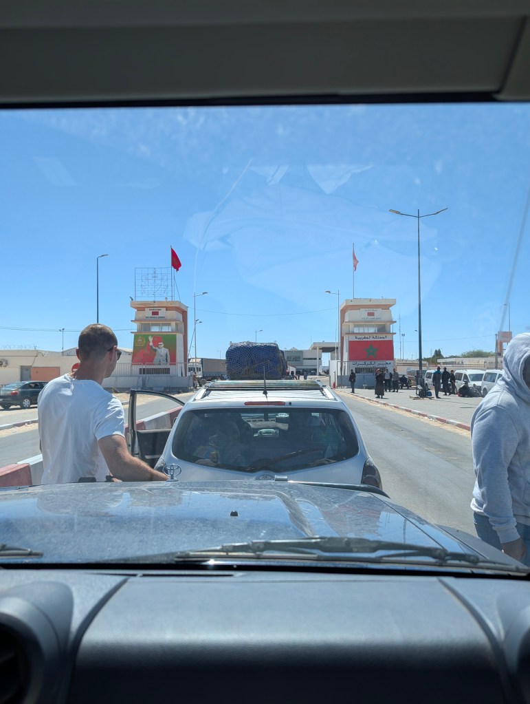 Om 12h30 zijn wij aangekomen aan de Marokkaanse kant. Wanneer je aankomt staat er rechts een enorme file met vrachtwagens, als auto kan je hier links voorbij en sluit je aan op de linkerbaan achter de auto’s. Er stonden 8 auto’s voor ons om door de poort te rijden. Na 4 auto’s hadden begon de lunchpauze & het gebed waarna de poort rond 15h00 weer openging. Om 15h30 mochten wij naar binnen. Het eerste wat ze vragen is of je een e-visum voor Mauritanië hebt, anders laten ze je niet door. Omdat we een hoge auto zijn moesten wij rechts, achter de vrachtwagens aan door de scanner.
