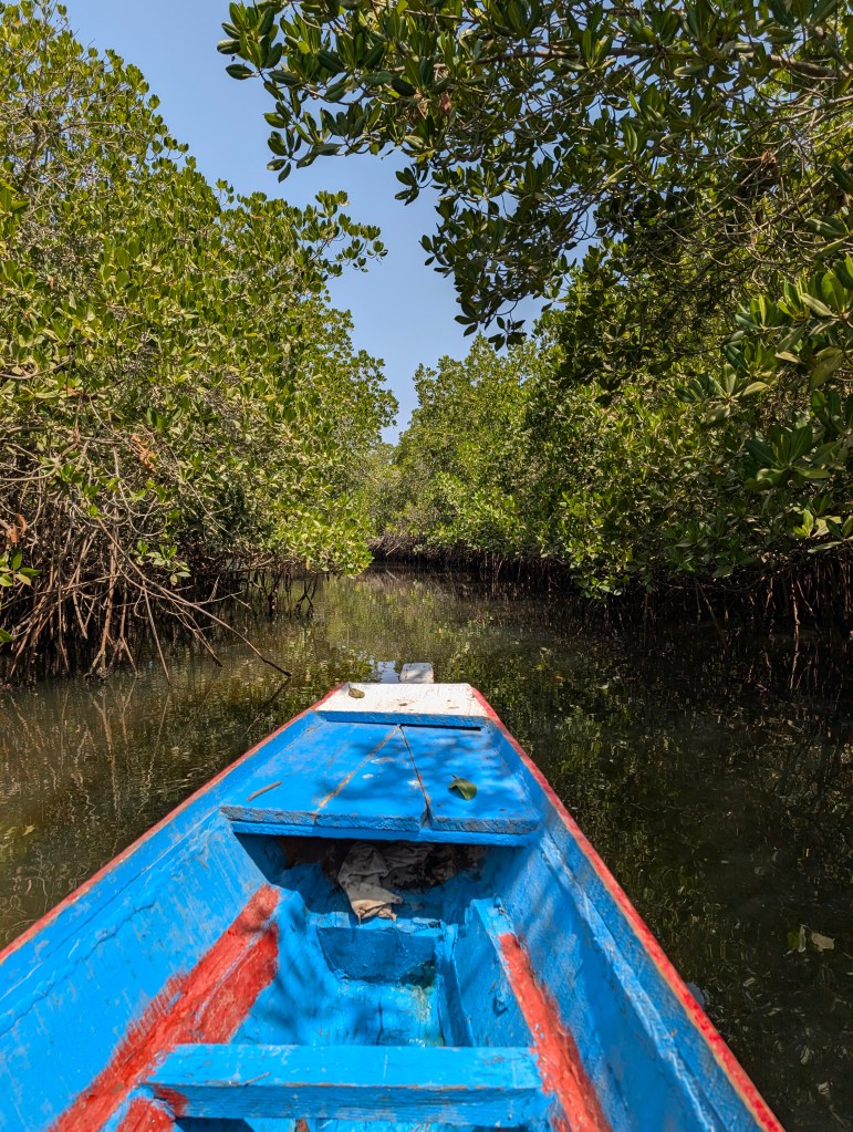 De Sine Saloum Delta was voor ons een hoogtepunt. Senegal heeft meerdere geweldige natuurparken maar dit is wel echt een van de meest indrukwekkende. De delta is enorm en de meeste eilanden zijn alleen met boot te bereiken. Hier gebruiken ze in Senegal ‘Pirogues’ voor, dit zijn uitgeholde boomstammen omgebouwd tot boot. Vaak zijn deze versierd is de meest indrukwekkende kleuren en patronen met teksten.
