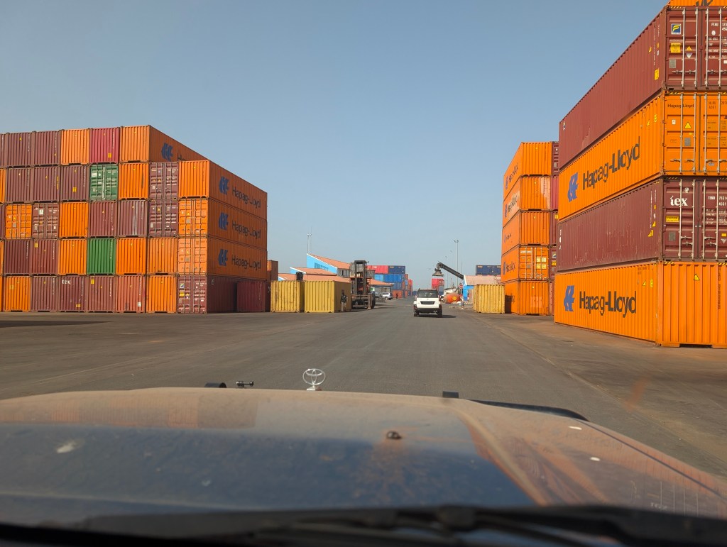 We mochten vervolgens mee naar de bescheiden haven van Guinee-Bissau. Hier worden alle noten met de boot naar Azië vervoerd. 90% dus van alle export, al deze containers zitten dus vol nootjes!