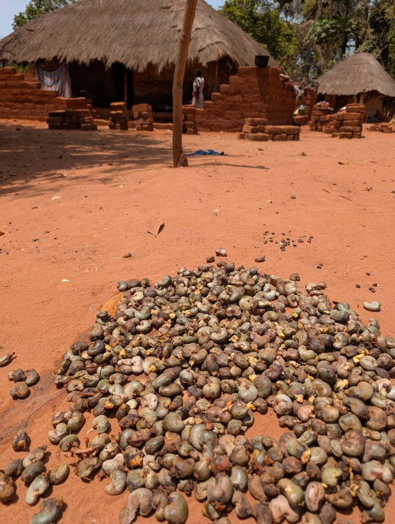 In de plantages worden de cashews geplukt die vervolgens op de grond in het dorp of langs de weg worden gedroogd.