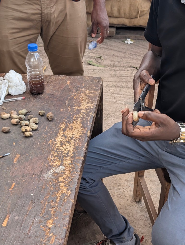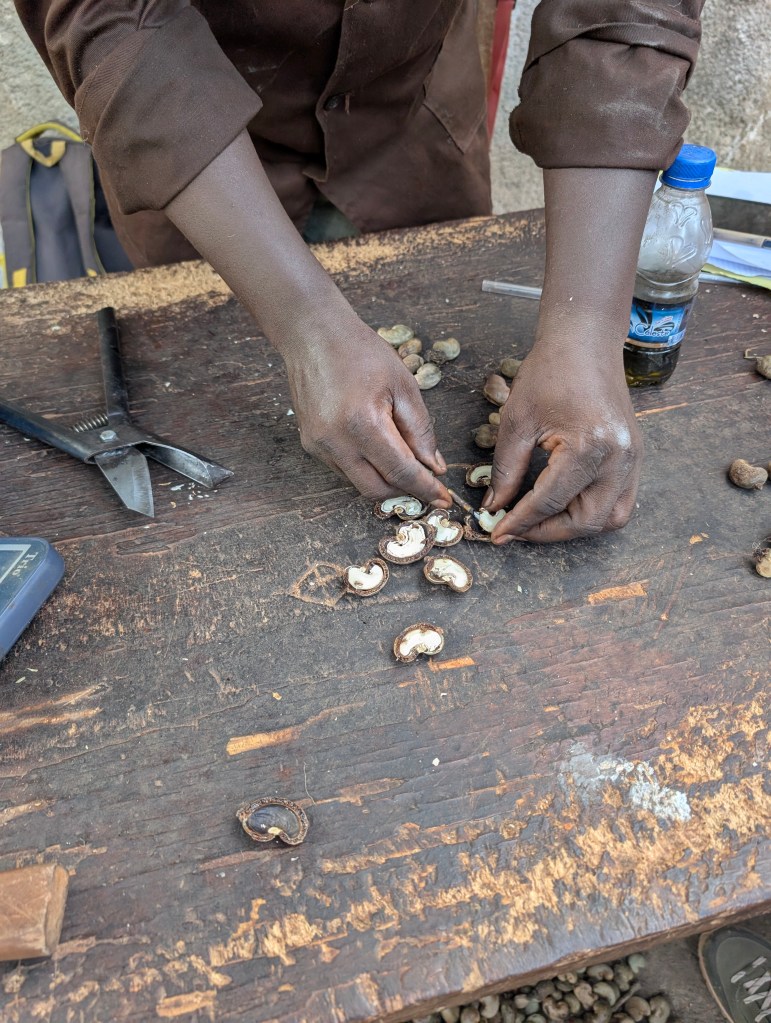 De plantages, cashewplantages zijn niet zo gestructureerd als onze Hollandse akkers. De bomen groeien overal met verschillende andere gewassen ertussen. De grootste uitdaging is de leeftijd van de bomen, kasjoebomen produceren wel 50 jaar cashewnoten. Dat betekent dat hele generaties gewend zijn dat de nootjes er gewoon volop zijn. Maar waar de vraag en export van de noten toeneemt, daalt de productie van de oude bomen. Dit betekent investeren in nieuwe bomen, die pas na 3 jaar nootjes produceren… veel gevraagd voor een van de armste landen ter wereld.