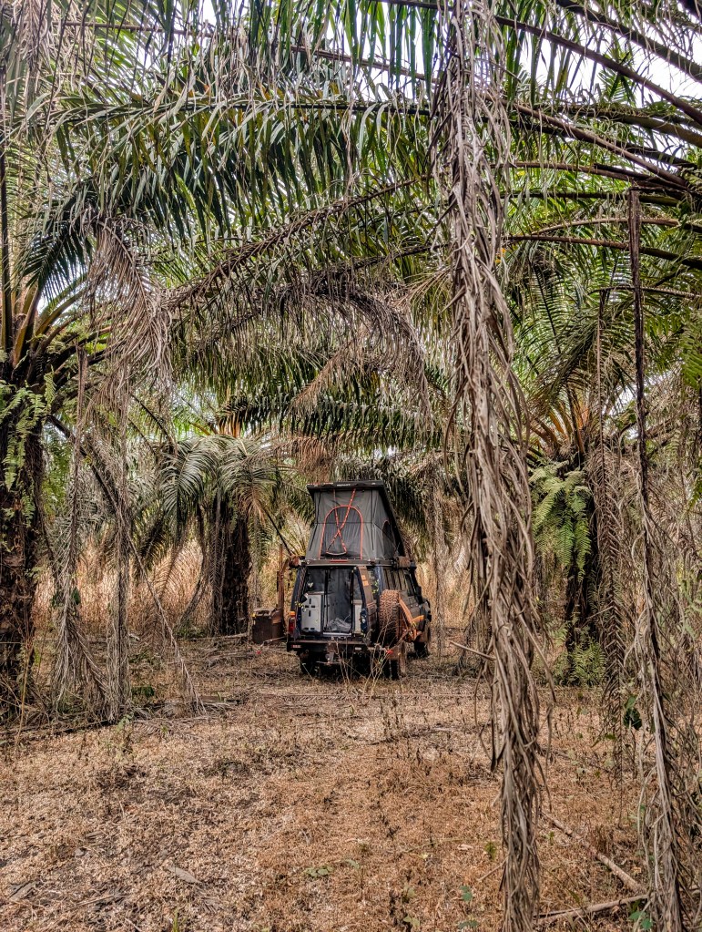 Na uren file reden we in het donker de stad uit en zijn we in een doodenge palmolie plantage tussen de donkere palmbomen in het wild gaan kamperen.