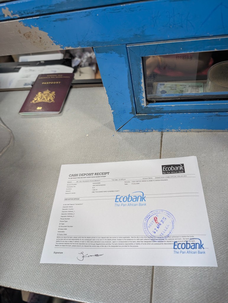De ambassade van Ghana was eindelijk open na het feestweekend! We reden eerst naar de bank, waar we een deposit hebben gedaan. Ontzettend druk bij de bank omdat je in Sierra Leone op deze manier je salaris cash kan ophalen. Uit de pinautomaten komt maar omgerekend 34 euro per keer uit de muur, dus dat schiet niet echt lekker op.