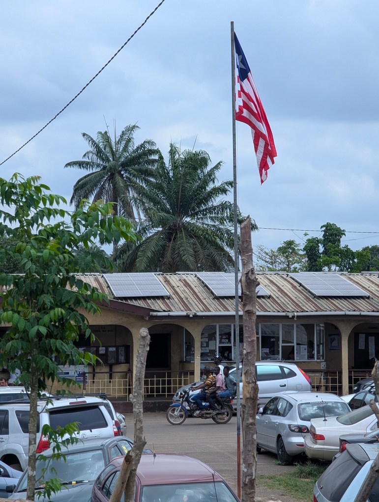 Je steekt de brug over om Liberia in te rijden. Weer stop je even bij een touw waar je je paspoort kort laat zien. Vervolgens ga je na dit touw linksaf (met je auto) hier zie je een groot gebouw waar de immigratie en douane samen zitten. Er zijn onder het afdakje meerdere hokjes waarboven aangegeven staat immigration of police/douane, let op dat je bij het hokje gaat staat met ENTER (en niet EXIT). Makkelijk en snel kregen we alle stempels voor paspoort en erna CdP. Om 12h15 rijden we weer weg bij de grens.