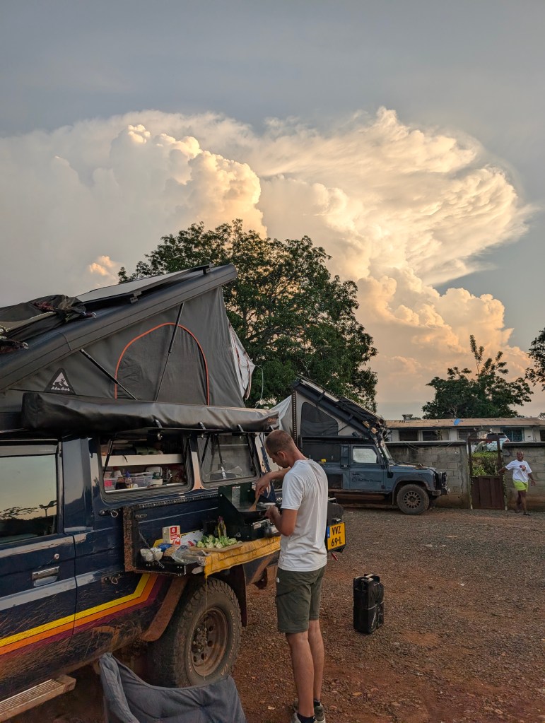 Aangekomen bij de Kameroense immigratie ging het even anders. We gaven onze paspoorten aan de politie, die ze vervolgens meegaven aan een man op een motor. We werden geïnstrueerd deze man te volgen. Na zo’n 5 minuten kwamen we aan bij het douanekantoor in een dorp in Kameroen, onze paspoorten werden niet aan ons gegeven maar aan de baas van de douane. Deze (gelukkig vriendelijke) man David vertelde ons dat we de paspoorten morgenochtend voor het konvooi terug zouden krijgen met een stempel erin. We mochten overnachten op het parkeerterrein van de douane (zonder enige voorzieningen maar in ieder geval veilig).