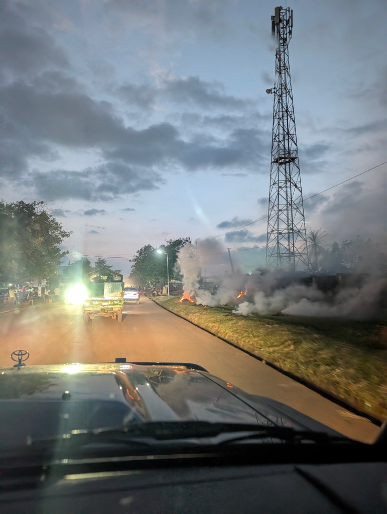 Na nog 30 minuten doorrijden stoppen we bij een politiebureau, op het moment dat we onze ramen naar beneden doen om informatie van Patrick te krijgen horen we in de verte de schoten van (semi) automatische geweren. Patrick vertelt ons dat de situatie onder controle is, maar dat we alert moeten blijven. We moeten dicht achter de auto voor ons blijven. Tot dit moment hadden alle soldaten hun helm ergens hangen in de auto en hun geweren tussen de benen of op de grond liggen. Ze dronken soms wat whiskey en rookten sigaretten. Maar dat was vanaf dit punt afgelopen. De helmen gingen op en de geweren werden op scherp gezet en naar buiten gericht. Nu werd het menens… Met ons hart in de keel was alleen een blik naar elkaar genoeg, we willen niet maar we moeten door.