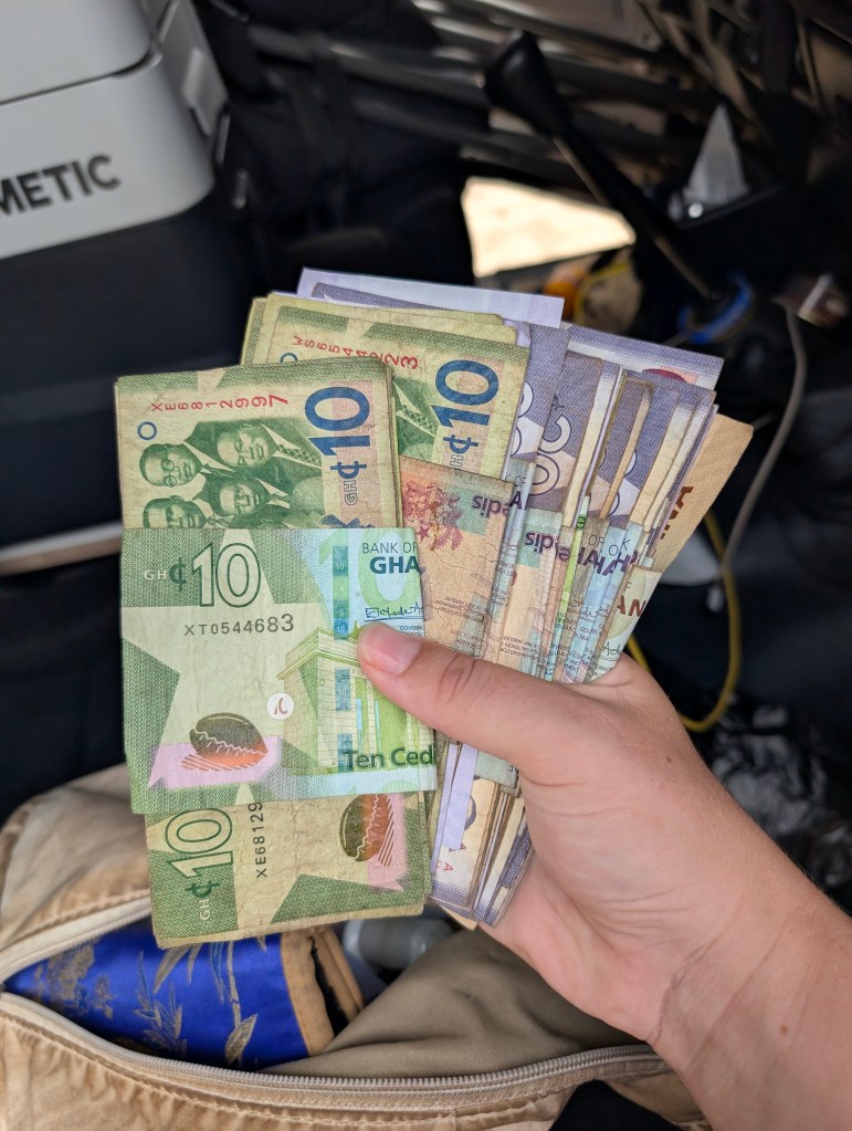Aan de Ghanese kant werden we geholpen door een geldwisselaar, waarbij we onze CFA naar Cedis hebben gewisseld. Hij gaf ons een betere koers dan op google! We hebben wel wat CFA bewaard omdat we deze in Togo en Benin nog kunnen gebruiken. Zo hoeven we niet opnieuw bij de grens met Togo te wisselen.