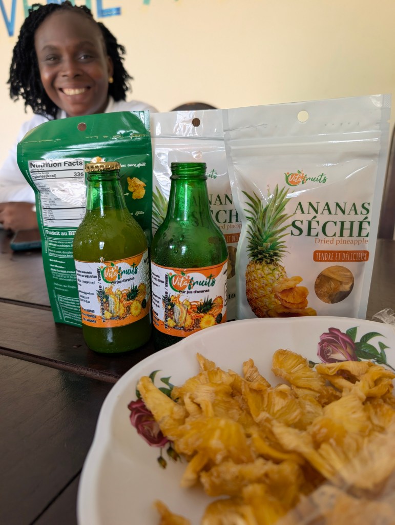 Een leuke kers op de taart: Door het CBI, Centrum tot Bevordering van de Import uit ontwikkelingslanden (een Nederlandse club), werden wij uitgenodigd om een van hun partners te bezoeken in Benin. In het noorden zitten ze bijvoorbeeld in de Shea markt (wij kennen het bijv. van sheaboter wat in veel lekkere cosmetica is verwerkt). Wij bezochten hier in het zuiden van Benin Laure van Vitafruit, een ondernemer die in samenwerking met CBI gedroogde ananas naar Europa zal gaan exporteren. Laure exporteert inmiddels al gedroogd fruit zoals ananas en mango en allerlei fruitsappen naar de rest van West-Afrika zoals in de buurlanden Mali, Burkina en Ghana maar ook helemaal naar Senegal. Vitafruits van Laure kan met de ondersteuning van CBI de Europese markt betreden en de concurrentie aangaan met Europese bedrijven. Vooral de gedroogde ananas, die hier als een gek groeit, zou een mooi product zijn voor de Nederlandse markt.