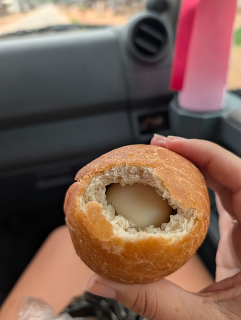 Mijn favoriet: puff puffs, een soort kleine oliebollen. Ze hebben ook de variant met een ei erin, genaamd egg roll. Er lekker (en superongezond).