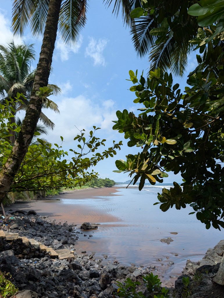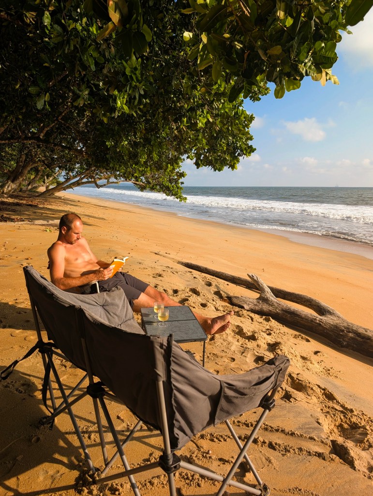 We bestellen vervolgens gamba’s met fried plantain en frietjes van Sylvain voor in de avond aan het strand en hebben een heerlijke nacht met zowel geluiden van de waterval als van de zee, kan het nog beter?