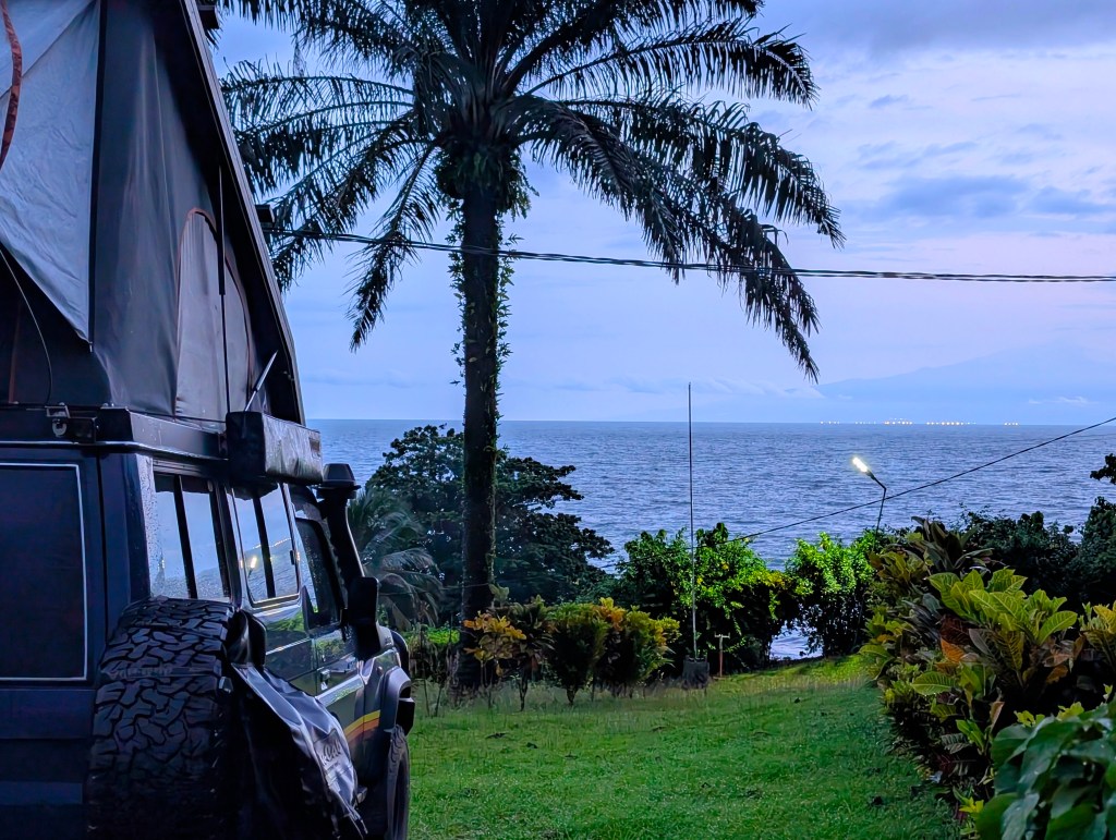 We worden wakker met een volledig uitzicht op Mount Cameroon, wat een prachtige vulkaan! We hadden in het donker geen idee dat we de berg konden zien, laat staan op deze manier.