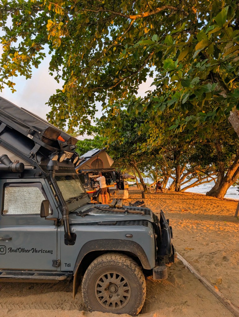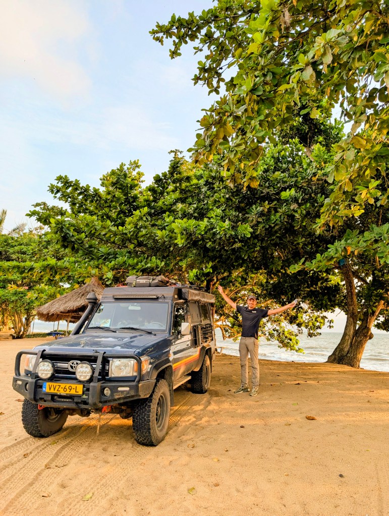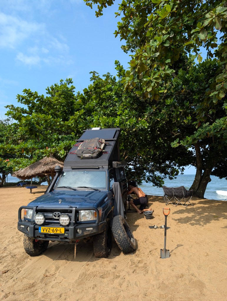 Sylvain, een restauranteigenaar bij de waterval ontvangt ons. We mogen hier gratis kamperen maar willen wel liever op het strand staan dan onder de bomen. We hebben immers zon nodig voor onze panelen. Een dame vertelt ons dat we hier prima mogen staan op het strand.