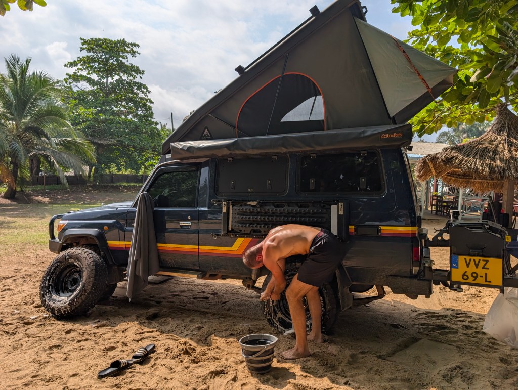 We slapen nog 2 dagen op deze heerlijke plek. Jasper probeert tussen de enorme onweersbuien en regen door de was te doen. We schuilen ondertussen op de veranda van een van de bungalows.