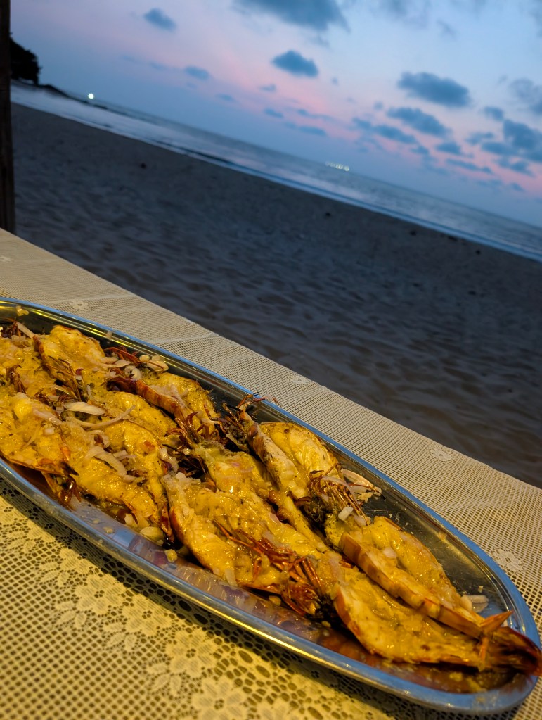 Avondeten: 2x bord friet met kip voor 6 euro (MEGA LEKKER!) en daarna 2x enorme gamba’s en vis met frietjes.