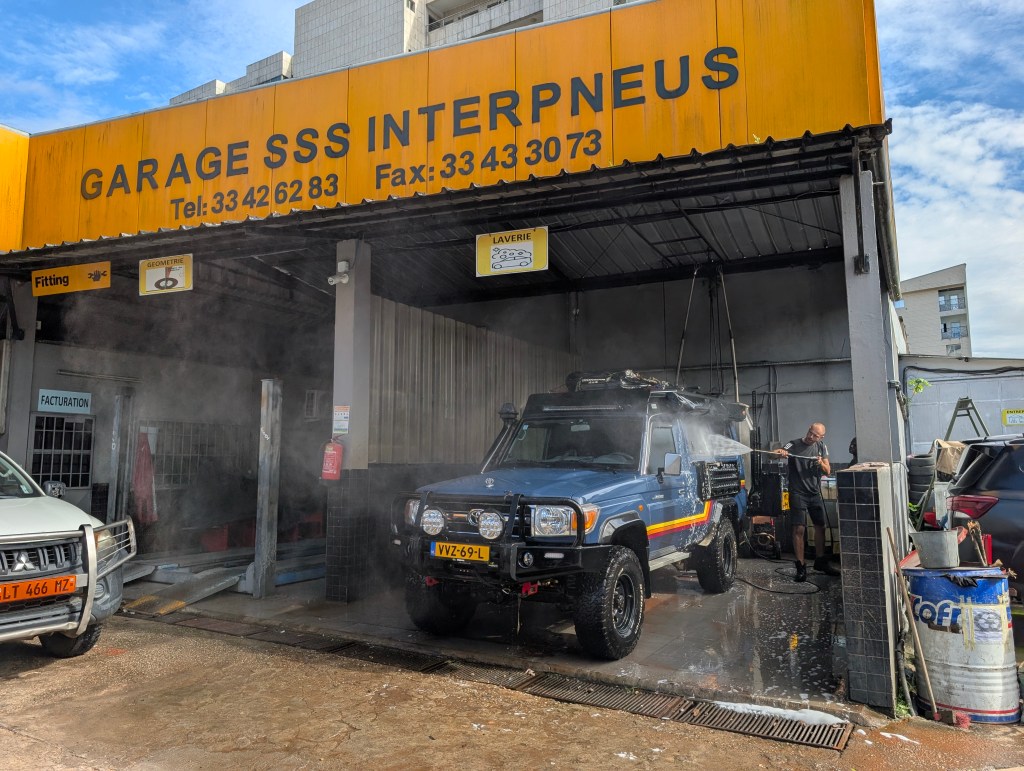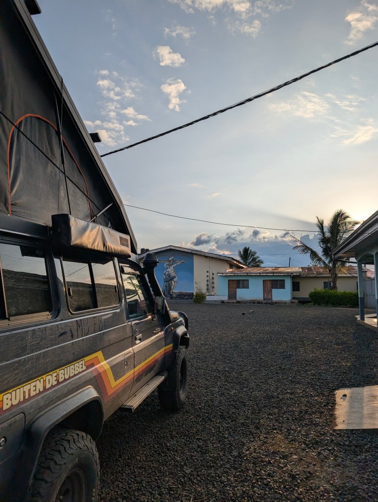 We willen pappa & mamma uiteraard van het vliegveld ophalen en vertrekken deze dag richting Douala. We gaan naar de Duitse Seamans mission, een plek in Douala met een zwembad en ze laten overlanders gratis op de parkeerplaats overnachten. Én je kan hier Duitse gerechten eten zoals schnitzel en braadworst, dat hebben we natuurlijk even geprobeerd!