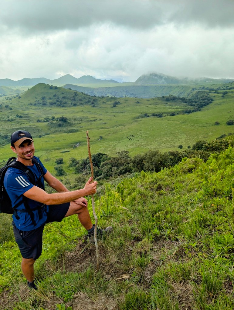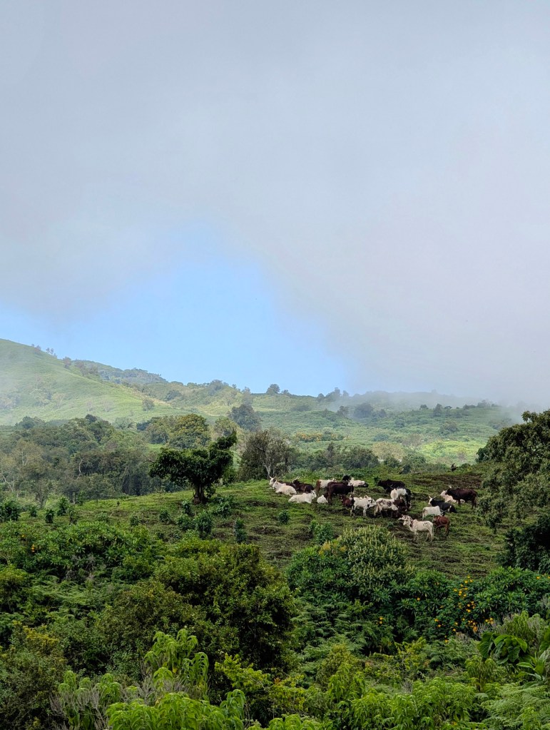 Time for a hike! We vetrekken vroeg in de ochtend om zo lang mogelijk de tijd te hebben. Voor deze hike staat 8 uur op Komoot en wij zijn niet de snelste wandelaars. Het begin is vrij stijl maar gelukkig wordt het na een paar uur een geleidelijke stijging. We komen in een soort oase met een alpenlandschap. Er zitten dorpjes van de Fula (een nomadevolk met voornamelijk vee in Afrika) op de berg waar ze vooral paarden gebruiken voor transport. Er zijn hier geen wegen of auto’s. Het is er zo prachtig en sereen. Hierna komt een kleine klim om de kraterrand op te komen, bovenaan komen we even op adem tussen de mist. De wolken trekken echter voor onze neus weg om ons te overdonderen met een geweldig uitzicht over de groene krater, het glooiende landschap, de twee meren, overal vrijlopend vee. Wat prachtig. We dalen stijl af de krater in en hebben lunch tussen de twee meren in, eentje diepgroen en duister (het mannelijke meer), de andere groot en blauw (het vrouwelijke meer).