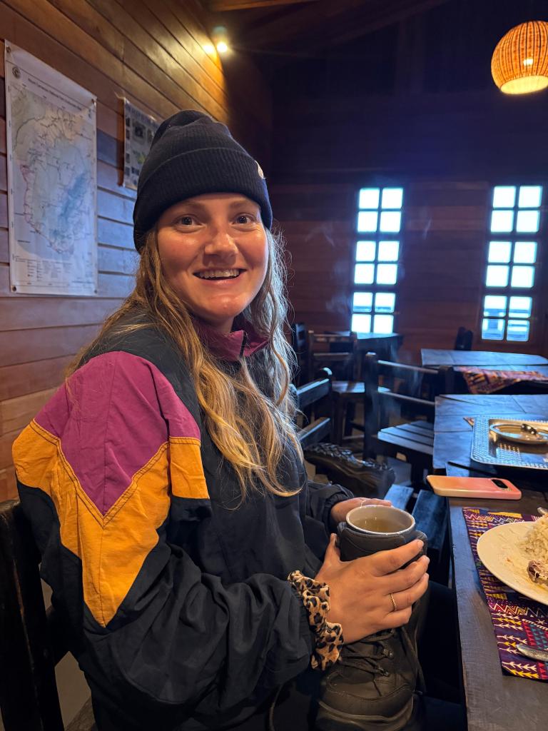 Hier aangekomen is het ijskoud maar gelukkig kunnen we een warme douche nemen en liggen er dikke dekens klaar. We proberen onze schoenen te drogen met kopjes hete thee en krijgen al avondeten heerlijke kip met friet.