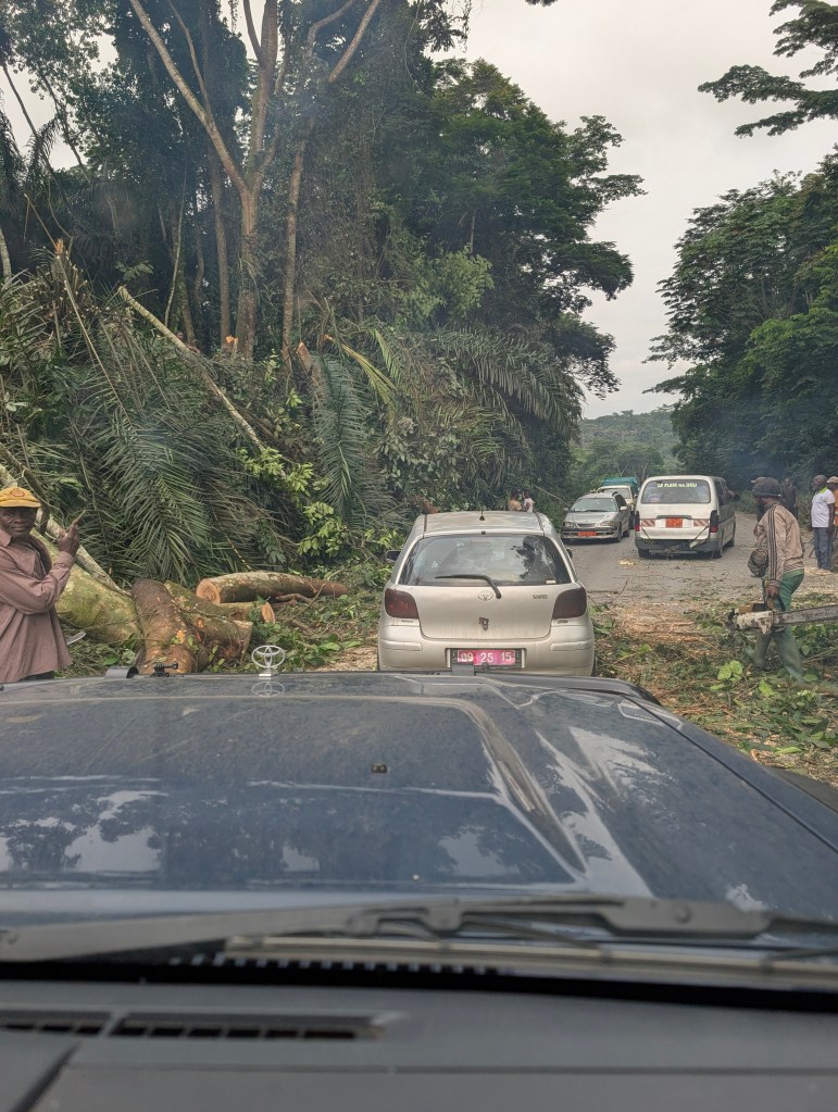 Een lange rijdag voor de boeg, we zijn laat weg in Douala en rijden zo’n 8h richting Yaounde waarna we uiteindelijk naar het natuurreservaat Dja willen gaan. We stoppen bij een hotel onderweg waar we ’s avonds lokale delicatessen eten zoals Ndole – een soort spinazie met vlees. Opnieuw veel regen.
