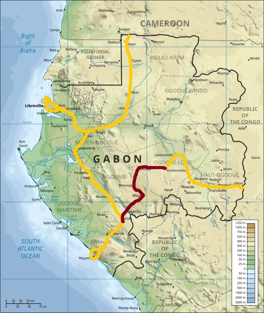 Op deze afbeelding zie je onze route door Gabon, het donkerrode deel was een moeilijke route door de jungle. De gele route was daarentegen niet altijd verhard of in goede staat!