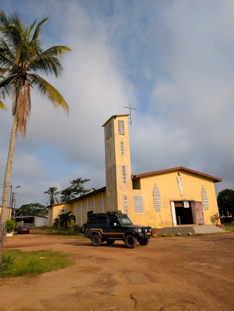 Op 18 juli rijden wij Gabon binnen via de grens met Kameroen in het noorden van het land. Officieel is deze grens dicht maar met wat volhardendheid en de juiste connecties lukt het ons toch om na een paar uur de grens over te steken. Omdat de dag bijna voorbij is wanneer we al onze stempels hebben ontvangen besluiten we in Bitam te overnachten. We kloppen aan bij een klooster naast een kerk en vragen of we hier kunnen slapen. Dat mag!