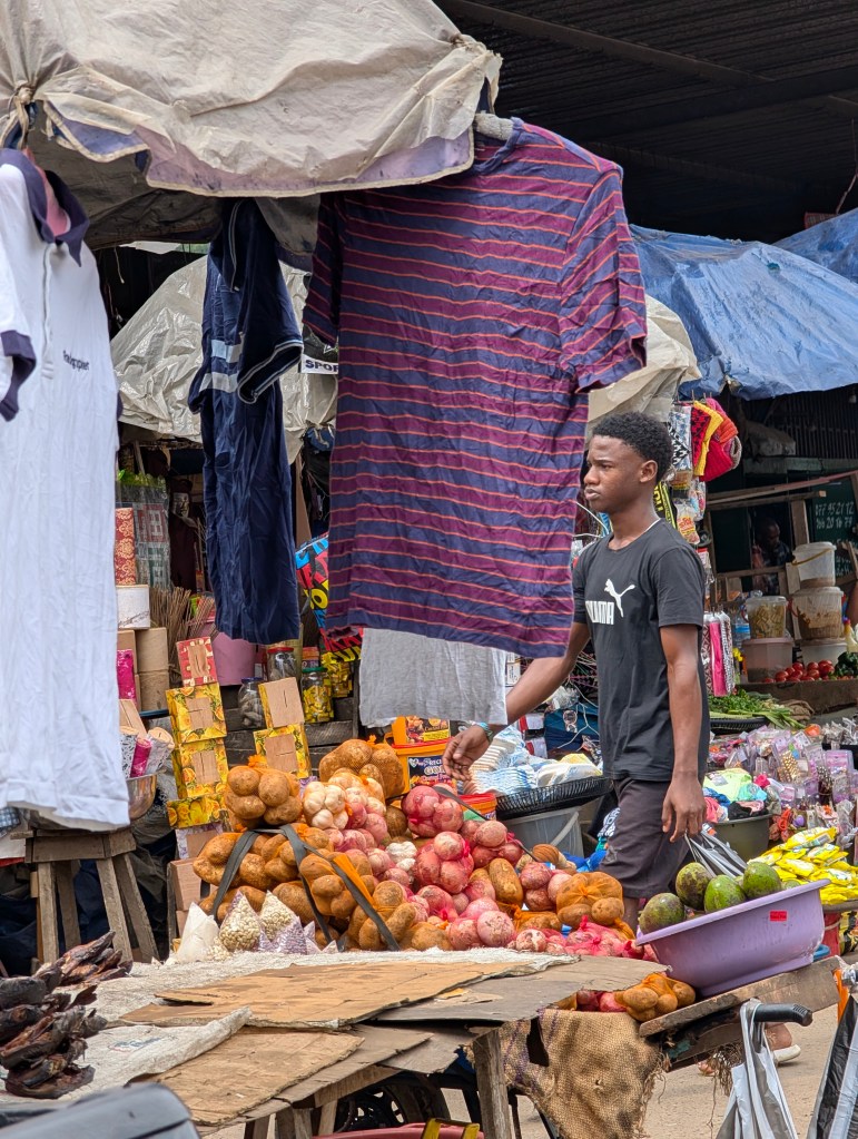 We slapen in de achtertuin tussen de kippen, hier leren we Ariole kennen die theologie in Kameroen studeert. Hij is 21 en hij wil zijn leven wijden aan de kerk. Hij nodigt ons uit om de volgende ochtend om 7h de kerkdienst bij te wonen.