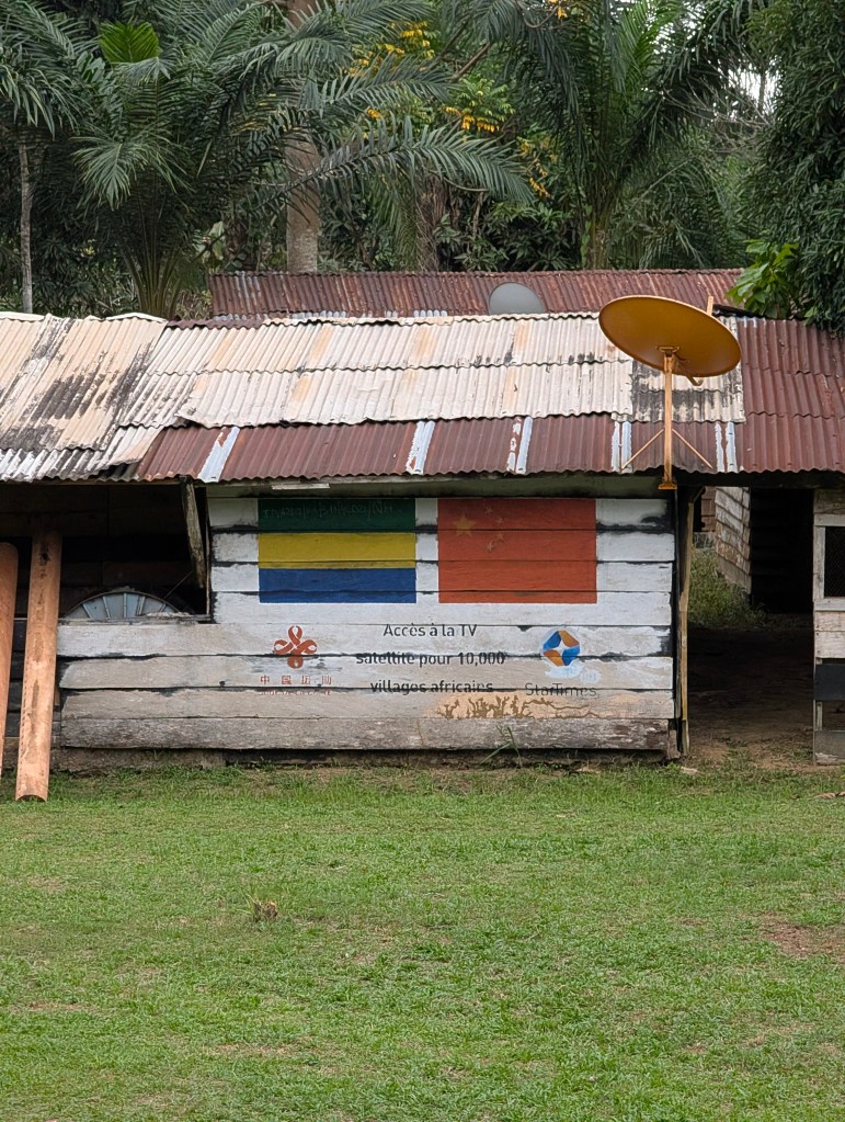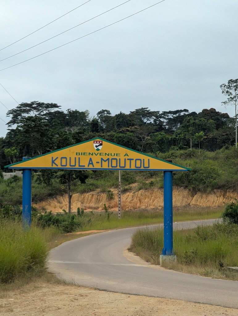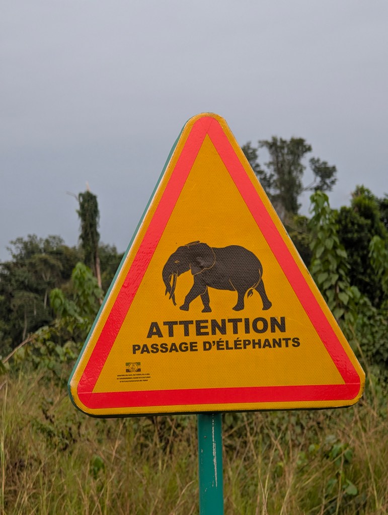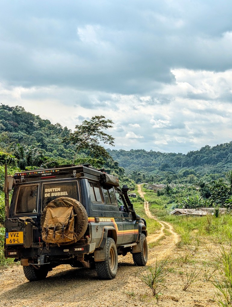 Na de kerkdienst om 7h met veel zingen en veel donaties aan de kerk (ook in de vorm van eten), is het tijd om afscheid te nemen. We betalen wat voor de gastvrijheid en vertrekken dieper de jungle van Gabon in. We steken de evenaar open en komen wat checkpoints tegen onderweg. Langs de weg hangt overal bushmeat te koop, van apen tot pangolins.