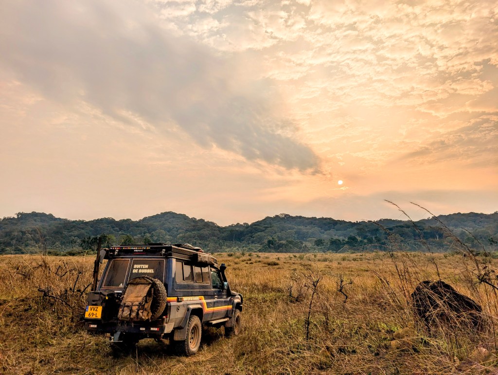 Na een tijdje halen de gidsen ons in en we volgen ze in het donker met 100 km/h over de zandweg en over de meest vervallen kleine bruggen. Een uurtje van het onderzoekscentrum wijzen ze ons een plek in het donker. Hier mogen wij kamperen. We hebben geen idee hoe onze omgeving eruitziet.