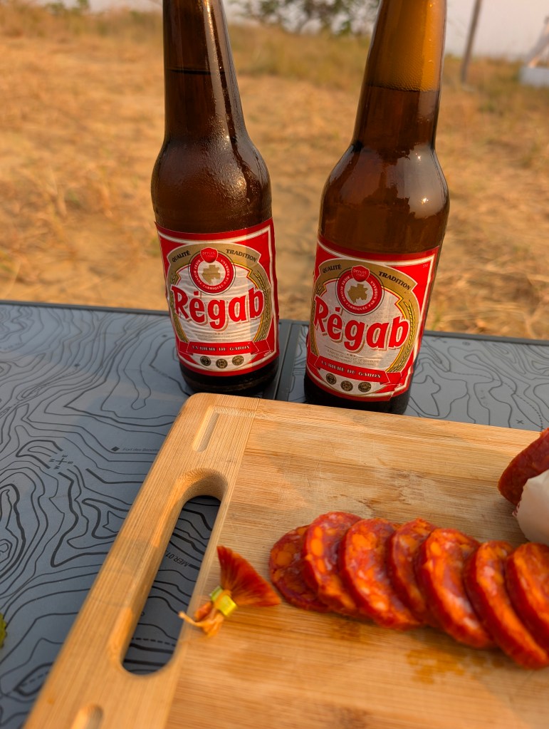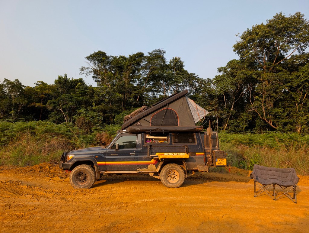 We rijden voorbij Libreville en gaan ten noorden van de stad op zoek naar een wildkampeerplek aan de zee. We stuiten echter op alleen maar betonnen muren en privéterreinen. Bij een terrein vragen we aan de bewaker of we hier mogen slapen. Dat was gelukkig geen probleem!