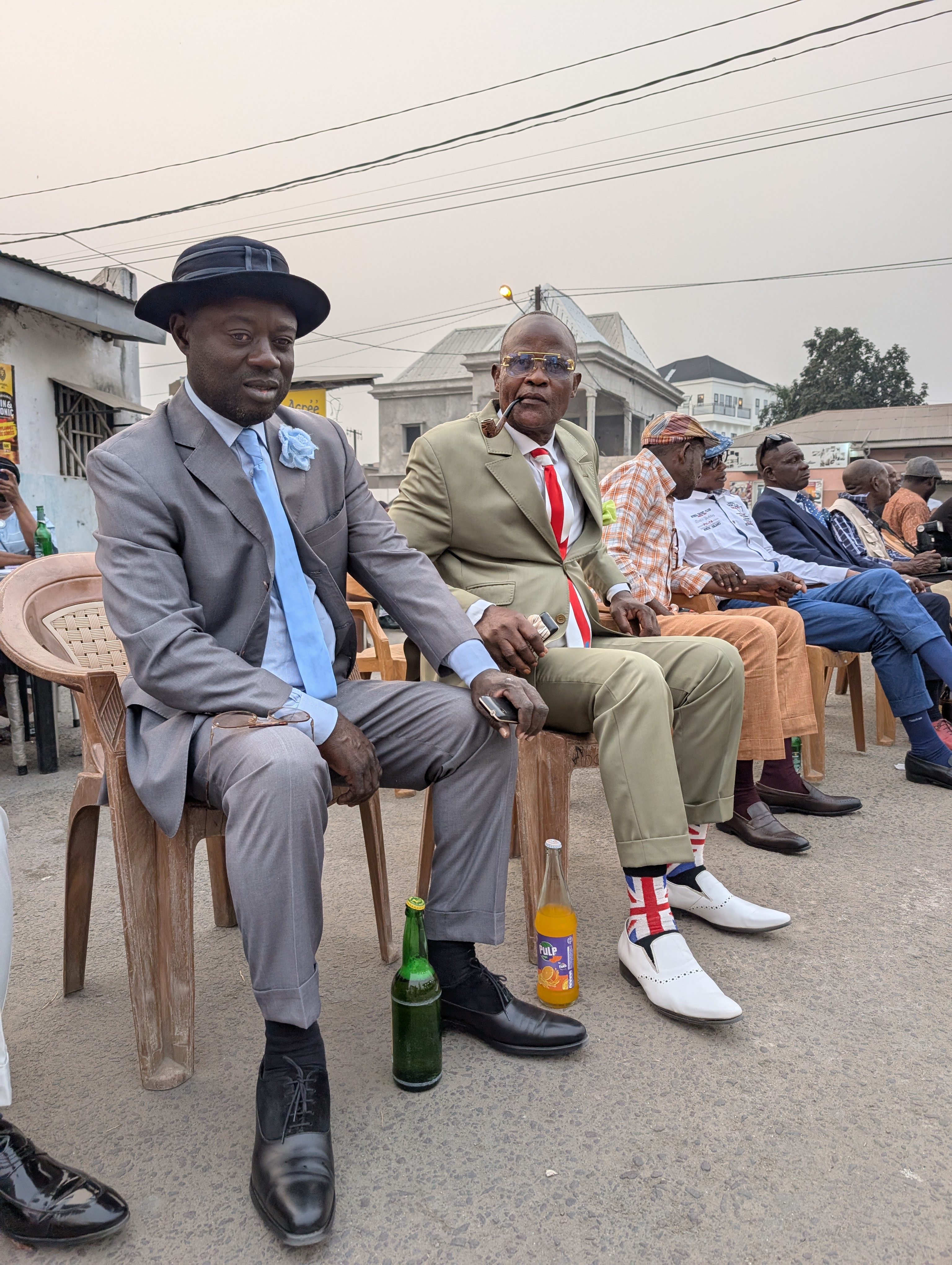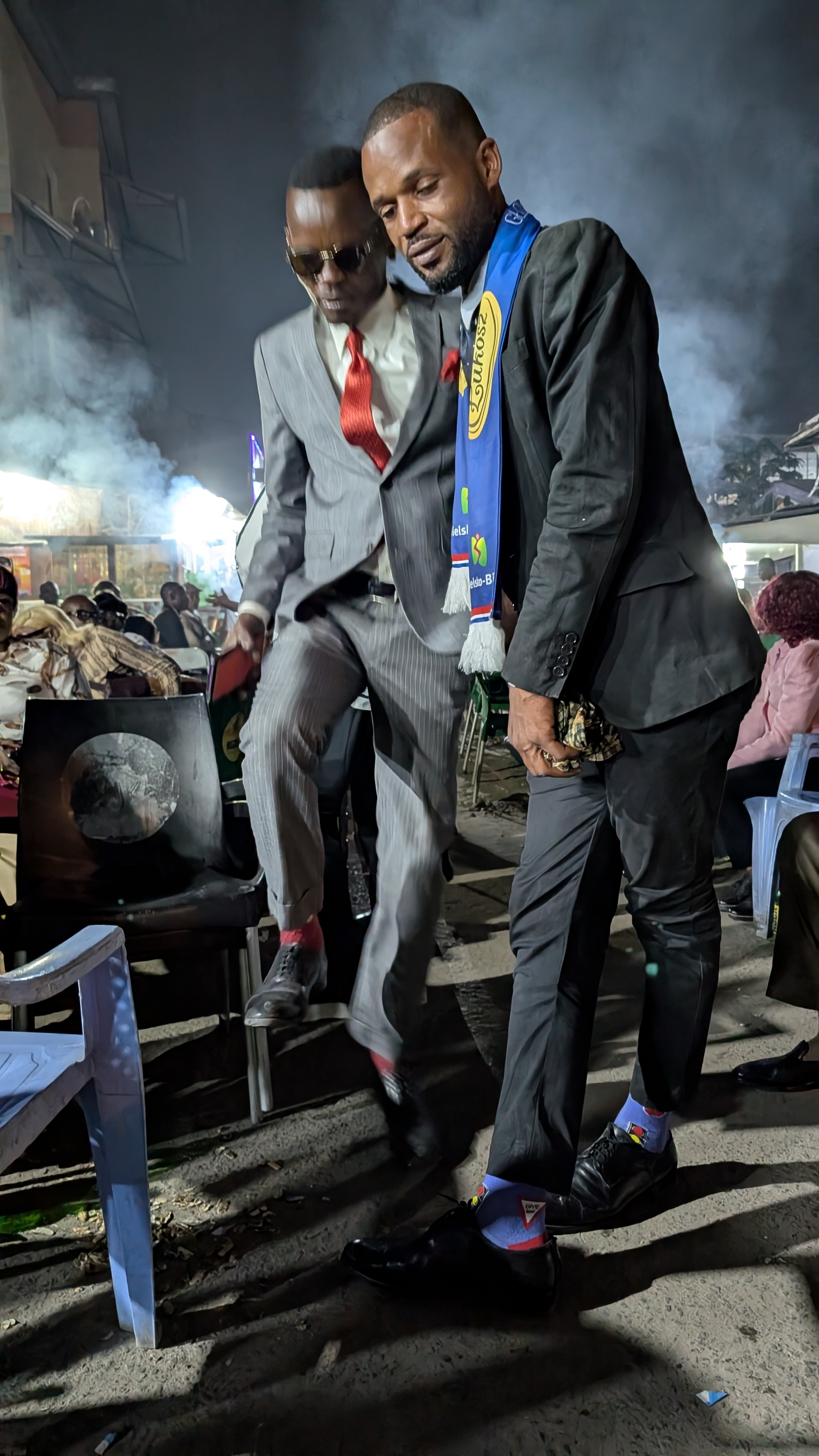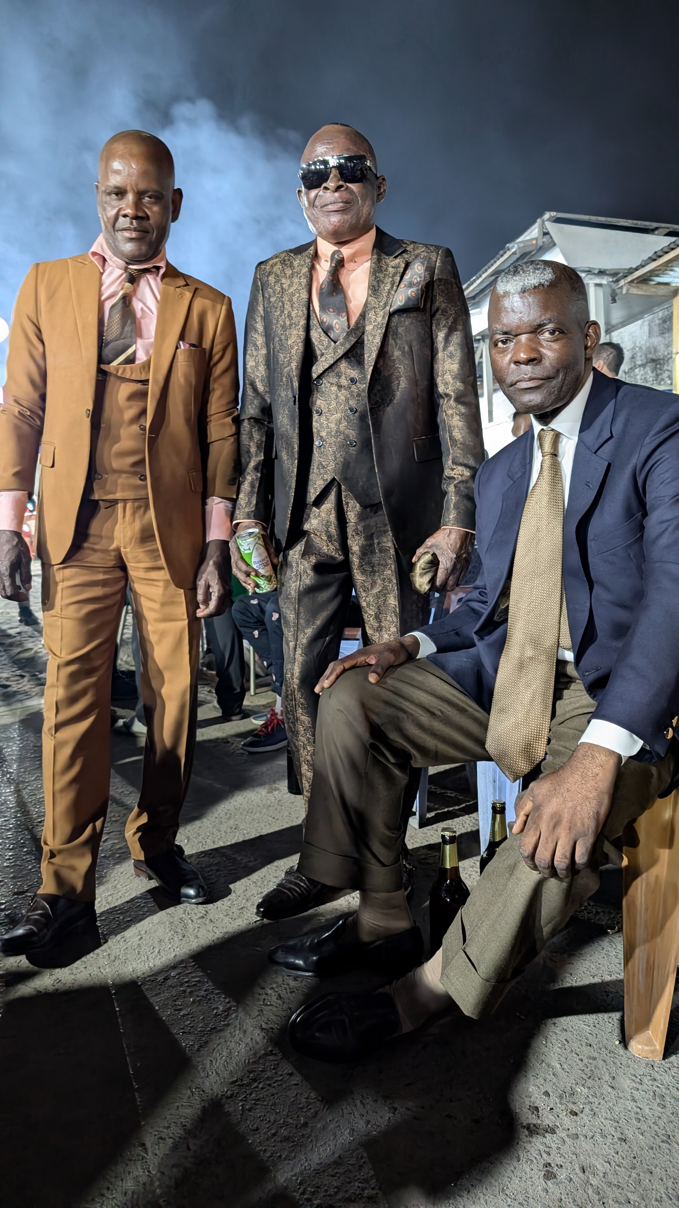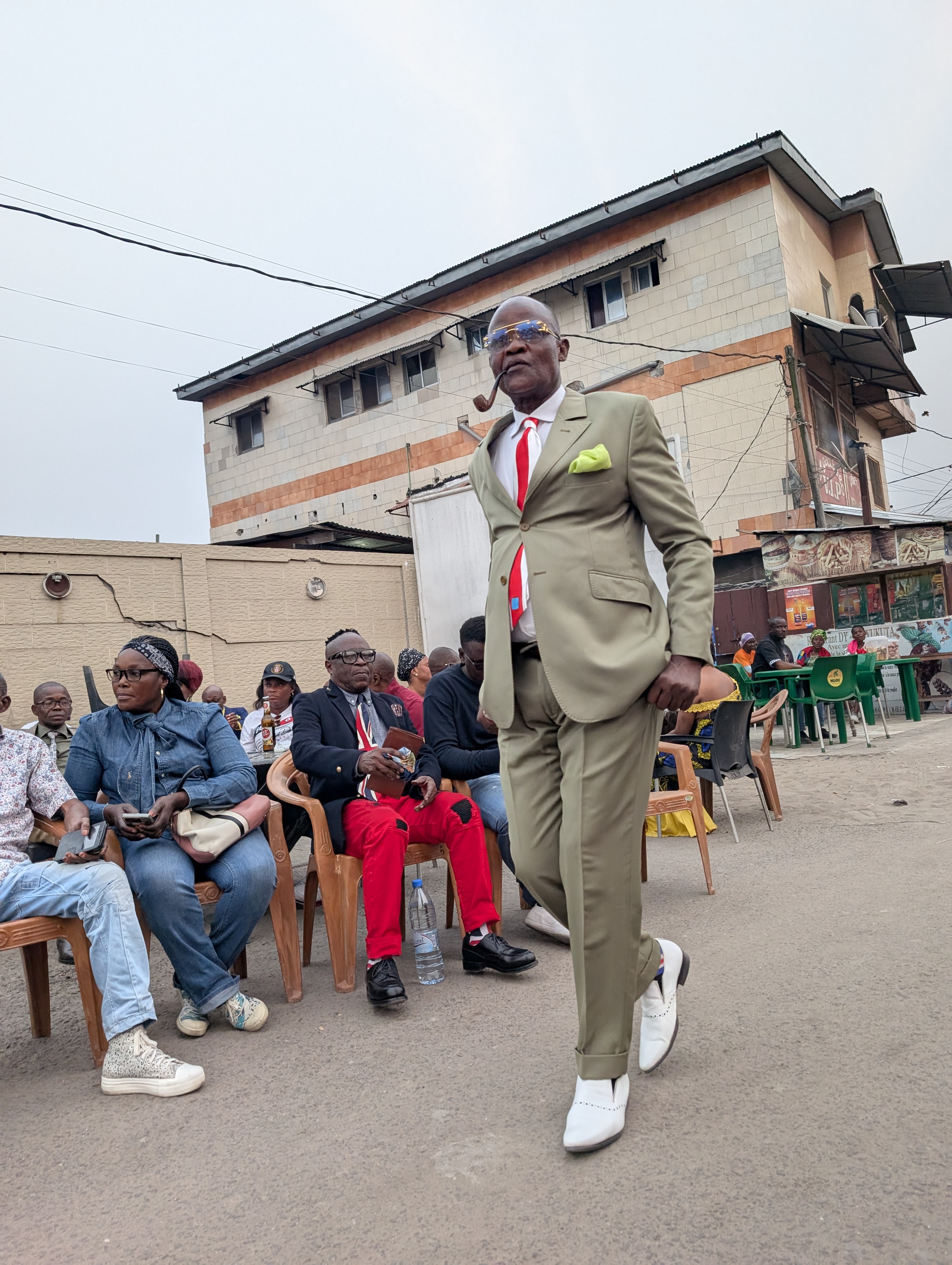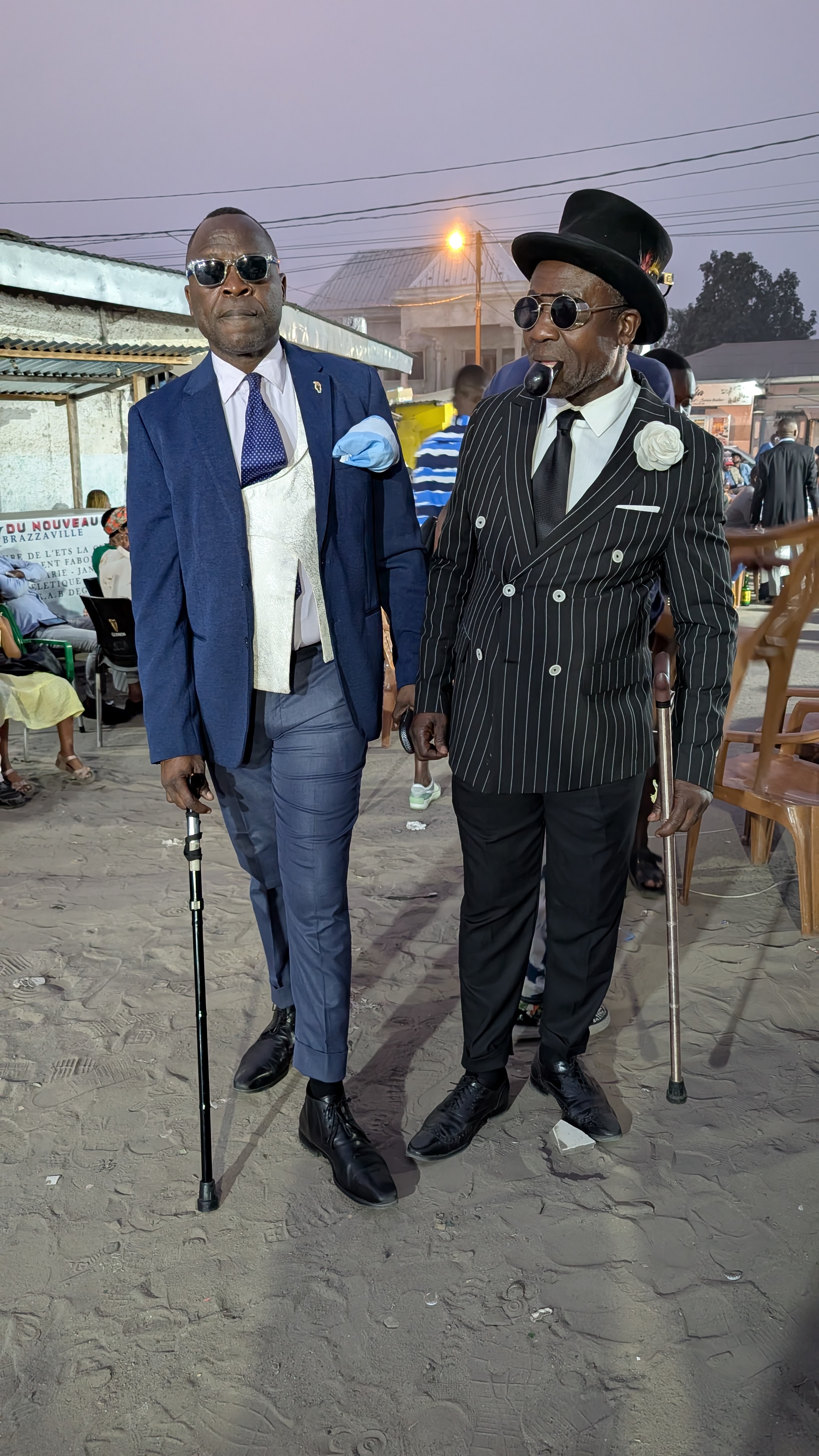 Sommige Sapeurs, zoals Romario (eerste foto rechts), kleden zich elke dag van de week zo. Romario heeft als bijnaam ‘le Roi des Sapeurs’ en is de oudste aanwezige Sapeur. Hij is in 1980 begonnen en verkocht kostuums maar is inmiddels met pensioen als kleermaken. Anderen van onze leeftijd kleden zich alleen zo op zondag. De rest van de week moeten ze werken (als ze al een baan kunnen vinden). Ze zien la Sapologie als een vlucht of een ontsnap moment uit hun harde werkelijkheid en armoede de rest van de week.