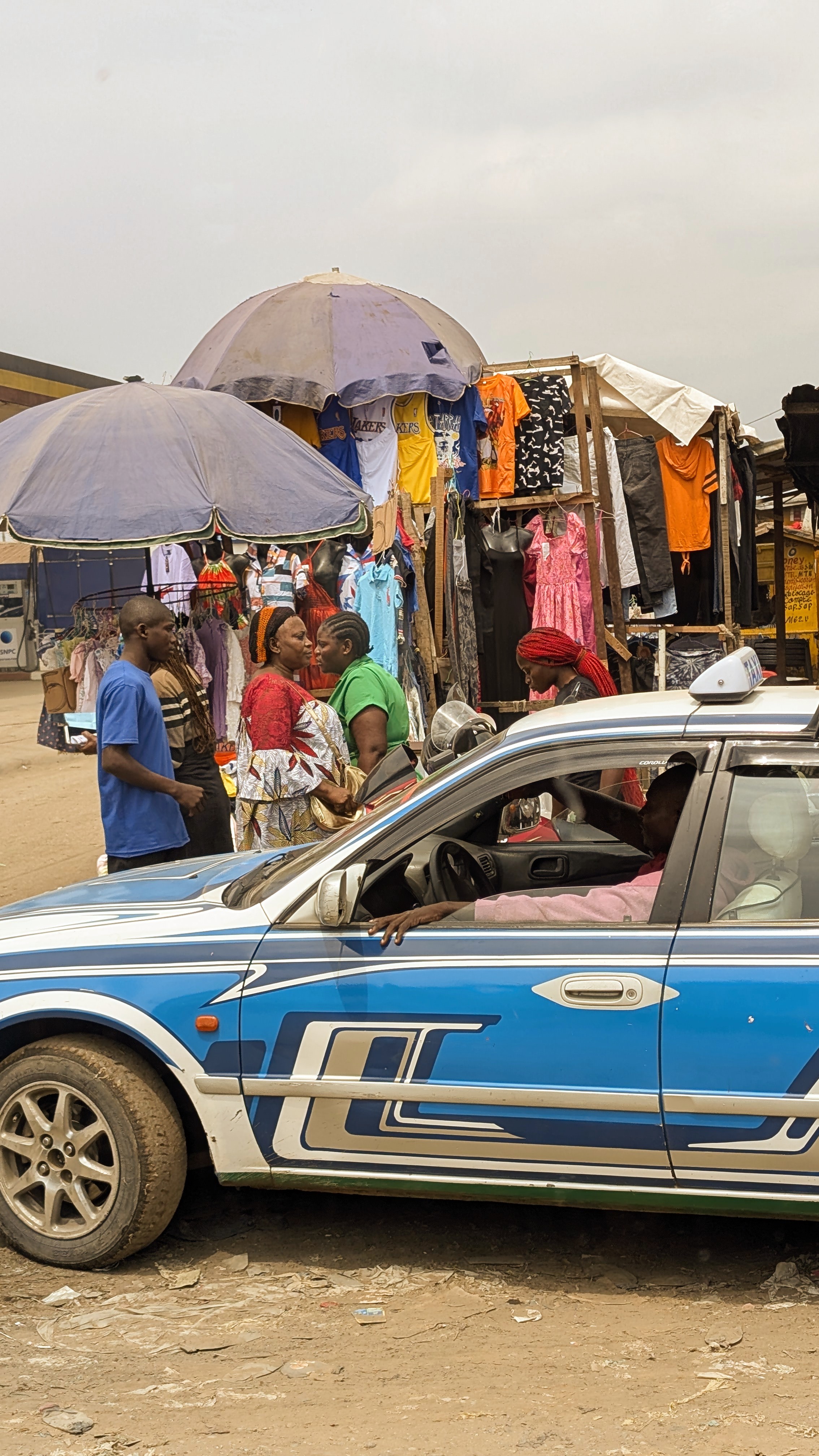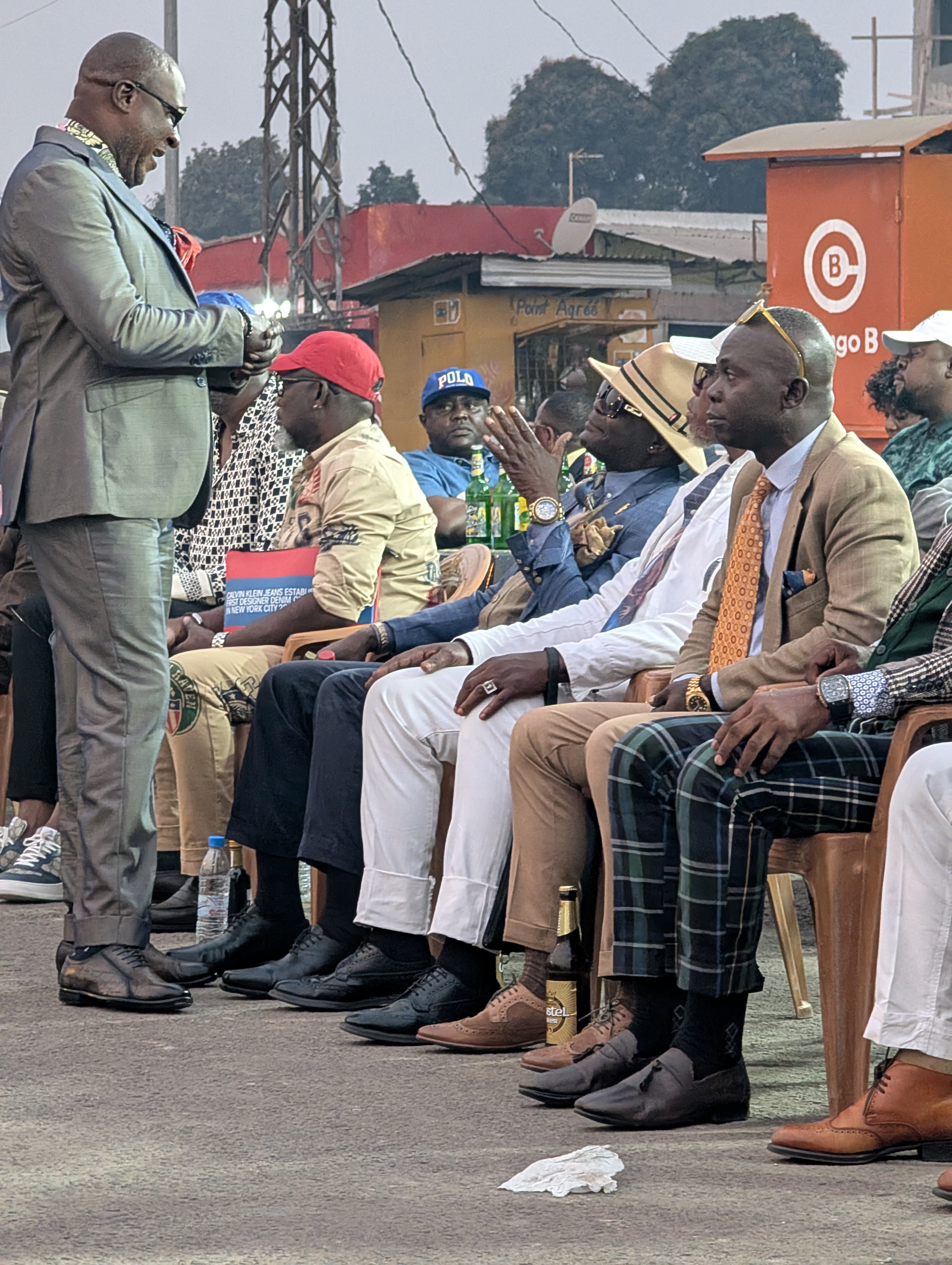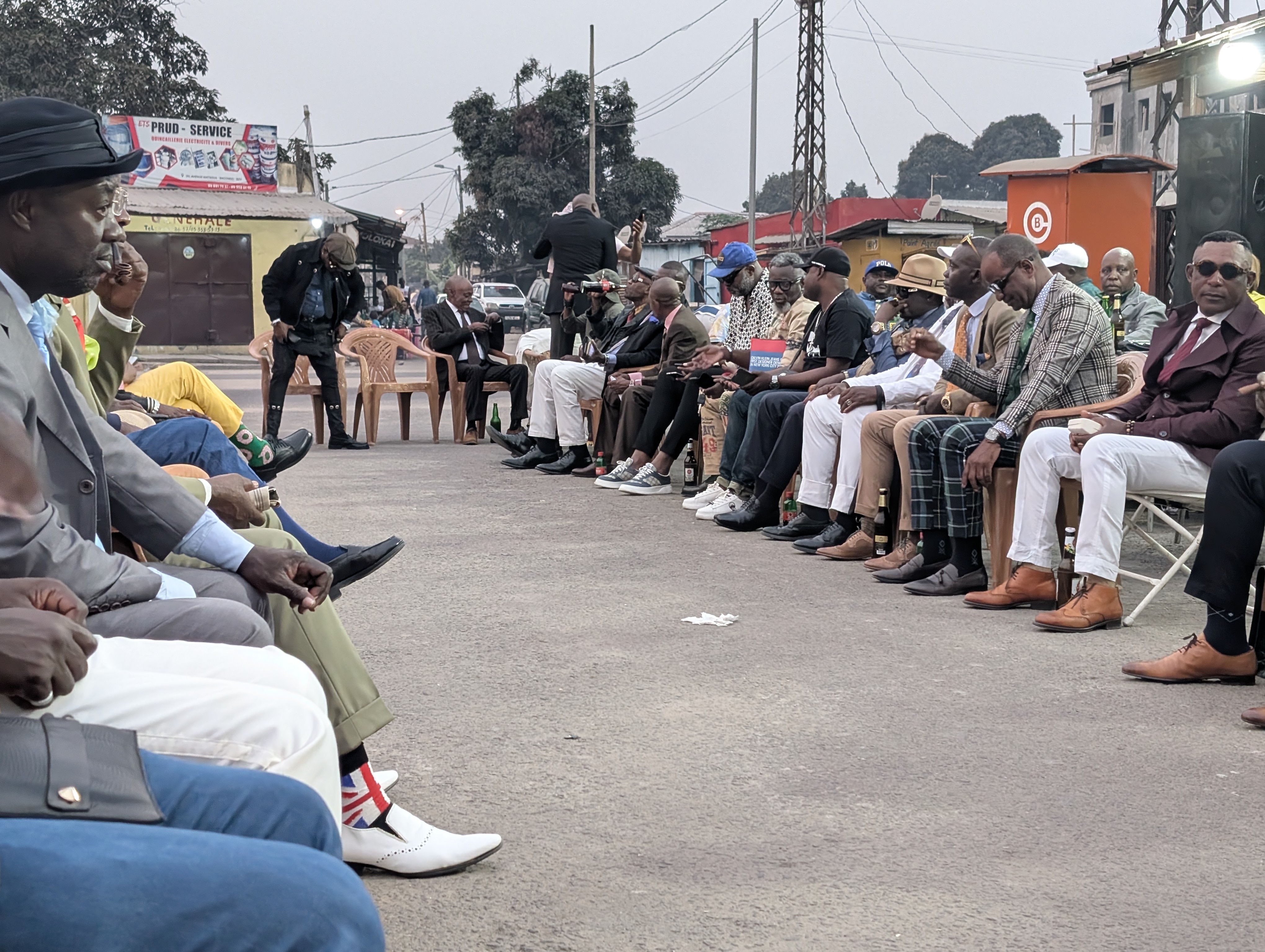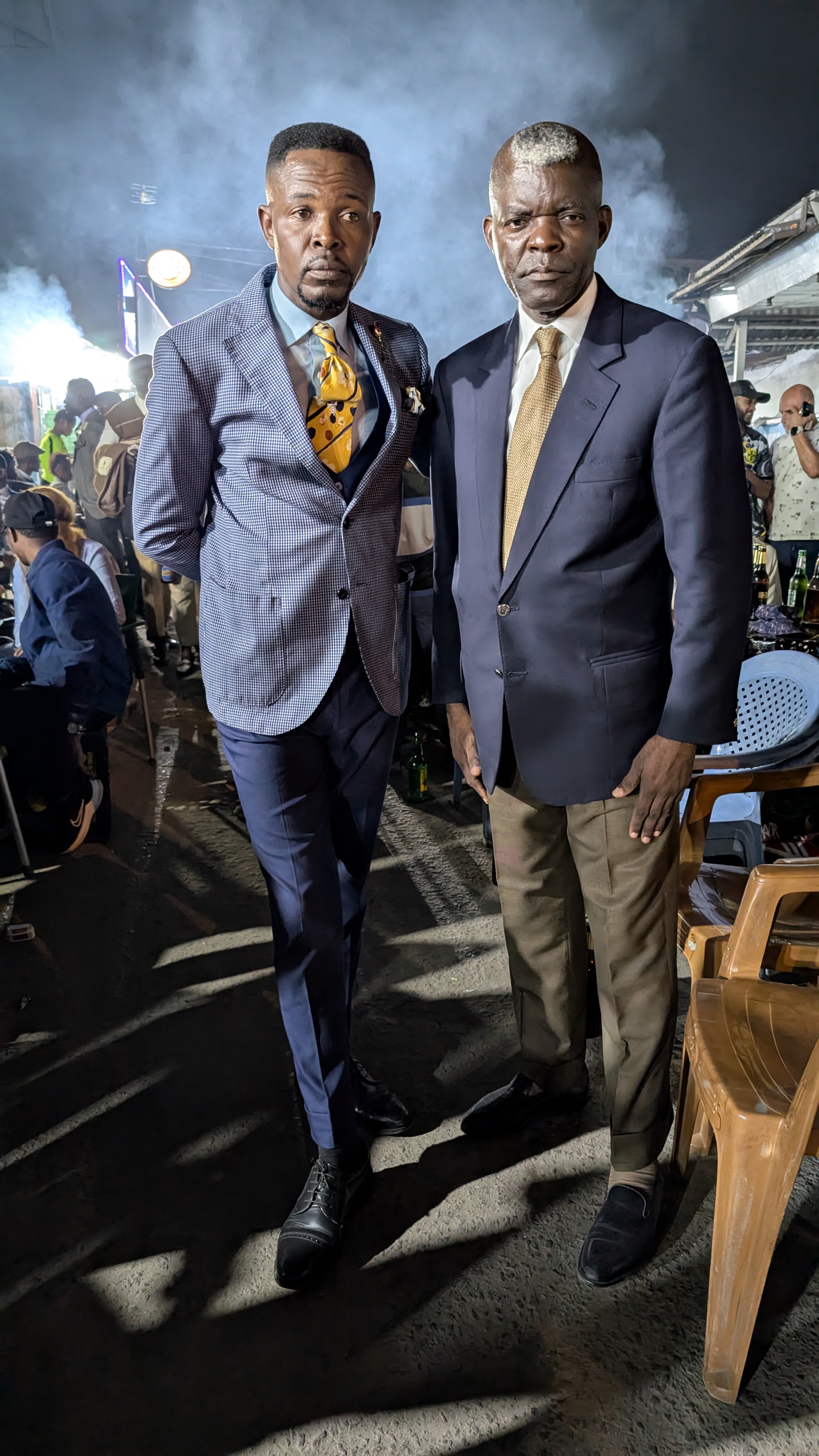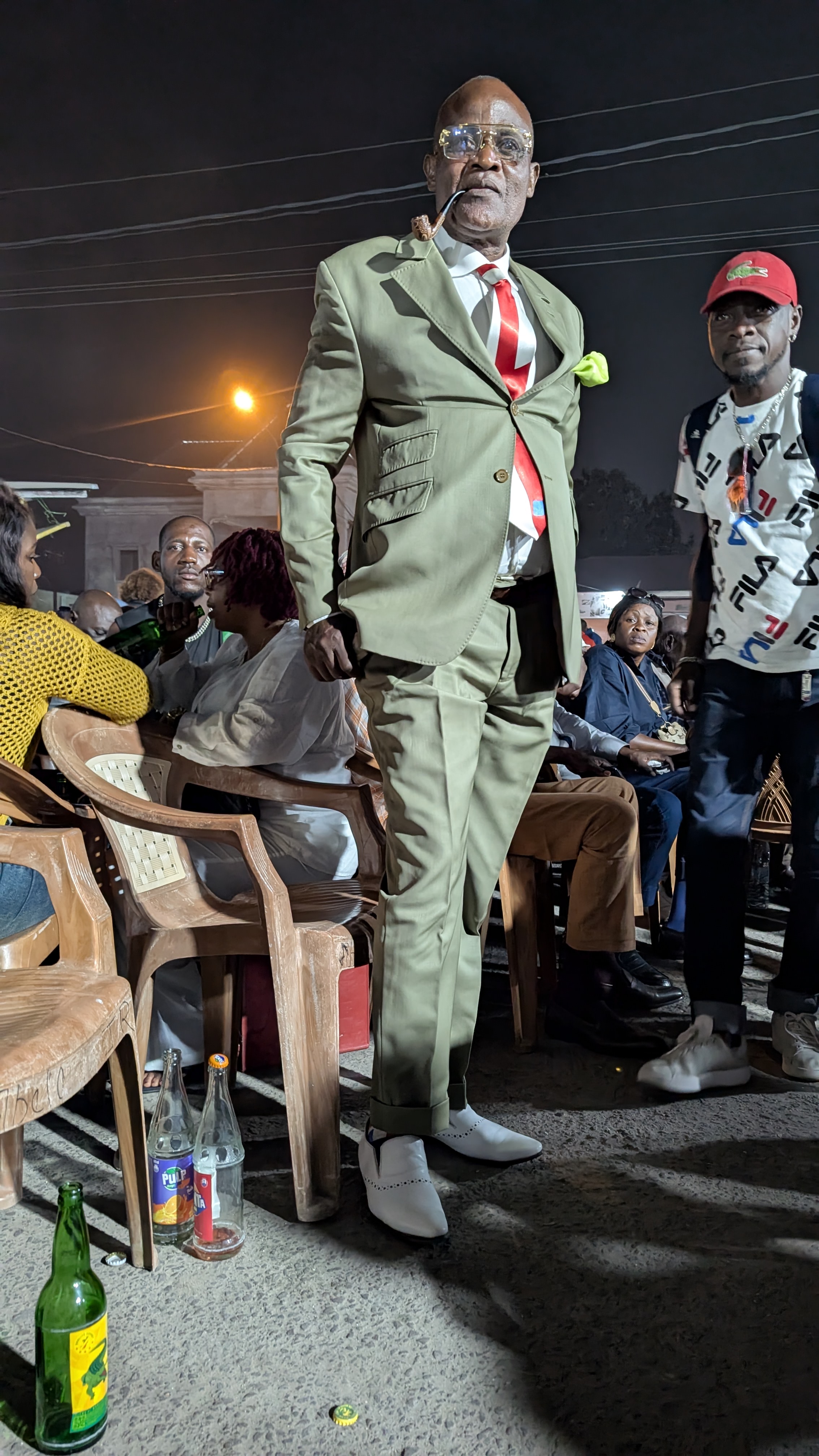 Sommige Sapeurs, zoals Romario (eerste foto rechts), kleden zich elke dag van de week zo. Romario heeft als bijnaam ‘le Roi des Sapeurs’ en is de oudste aanwezige Sapeur. Hij is in 1980 begonnen en verkocht kostuums maar is inmiddels met pensioen als kleermaken. Anderen van onze leeftijd kleden zich alleen zo op zondag. De rest van de week moeten ze werken (als ze al een baan kunnen vinden). Ze zien la Sapologie als een vlucht of een ontsnap moment uit hun harde werkelijkheid en armoede de rest van de week.