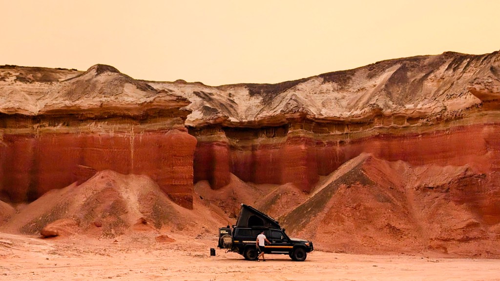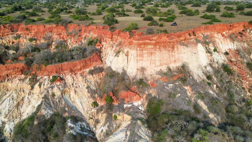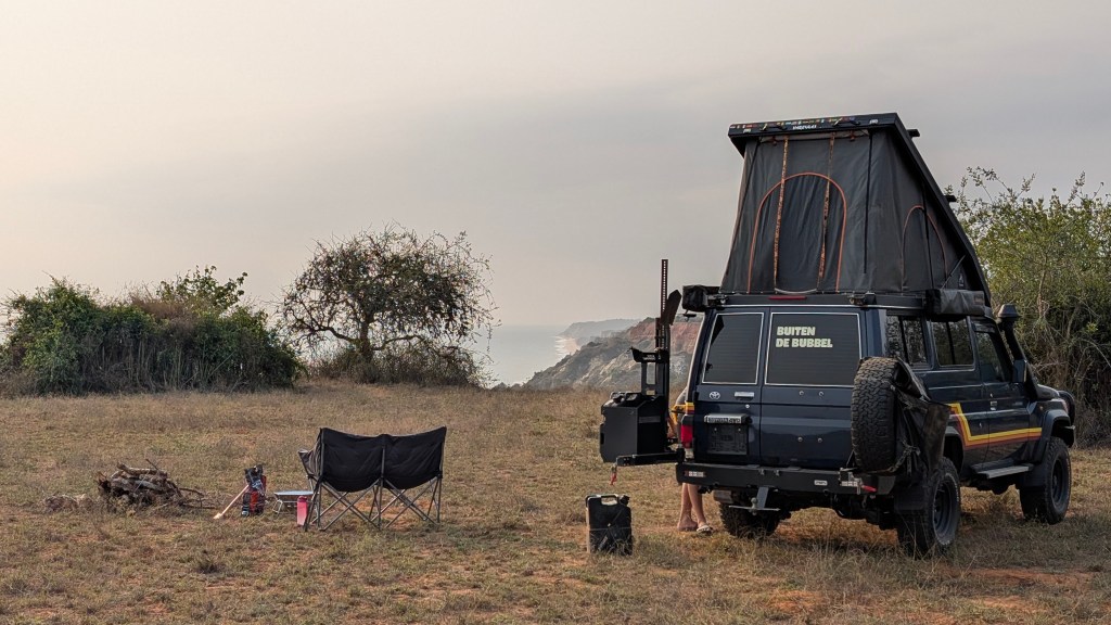 We rijden de stad uit naar het zuiden, langs de kust van Angola heb je overal namelijk prachtige kliffen. Ongeveer 2 uur rijden van Luanda vind je een uitzicht op de zee met een soort maanlandschap ertussen, echt prachtig. We gooien de drone hier omhoog en twijfelen of we hier willen kamperen maar er komen toch best vaak auto’s met toeristen om van het uitzicht te genieten. We besluiten door te rijden naar een wild kampeerplek een uur verderop op een klif. Dat was een geweldige beslissing. Vanaf het moment dat we parkeerden hebben we geen andere mensen meer gezien tot de volgende dag. Het uitzicht was ongelofelijk en de kliffen minstens even mooi als bij het uitzichtspunt hiervoor.