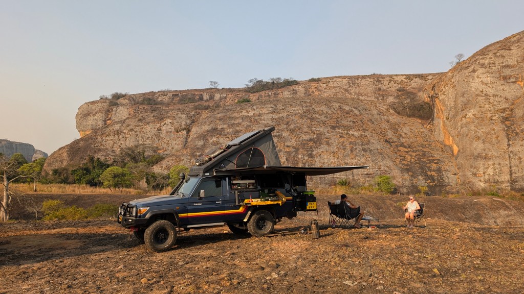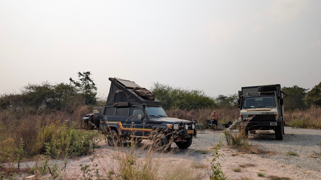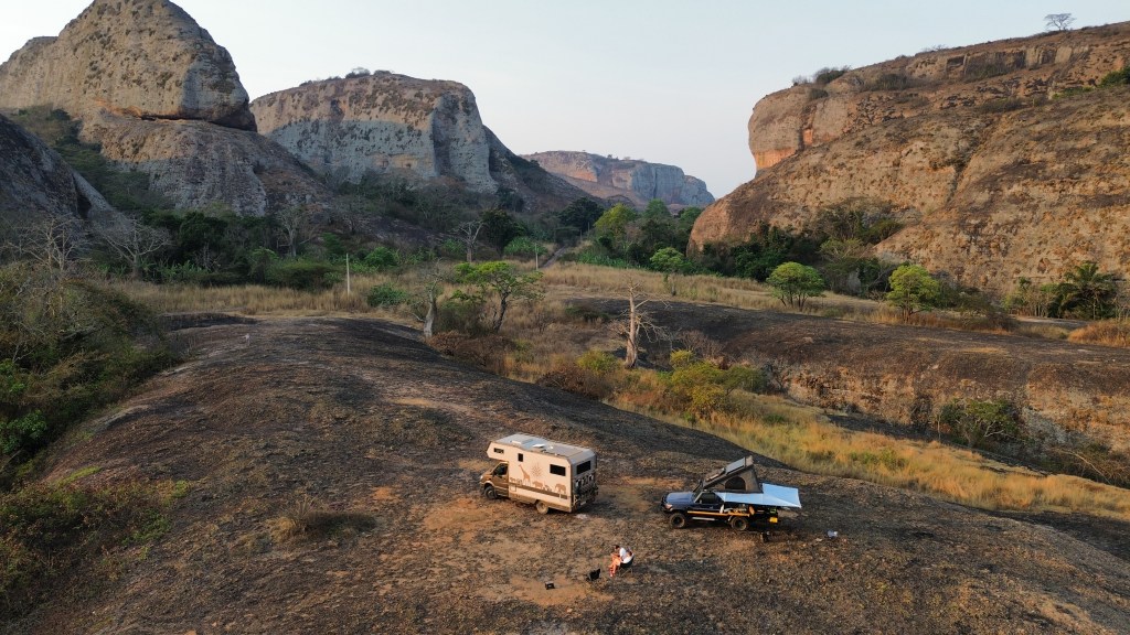 9 augustus steken we de grens over van DRC naar Angola. Je leest meer over deze grensovergang in deze blog: GRENS: DRC IN & UIT. Het eerste stuk van de weg is ontzettend slecht, we rijden ze lang mogelijk en zoeken dan een wildkampeerplek. We dachten een plek gevonden te hebben maar door alle wildfires om ons heen besluiten we toch te verplaatsen. Iets verder vinden we een gravelpit met (voorlopig) nog geen branden in de buurt.