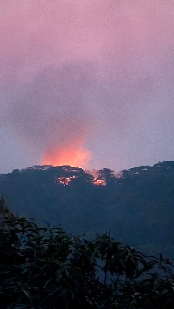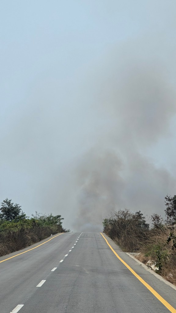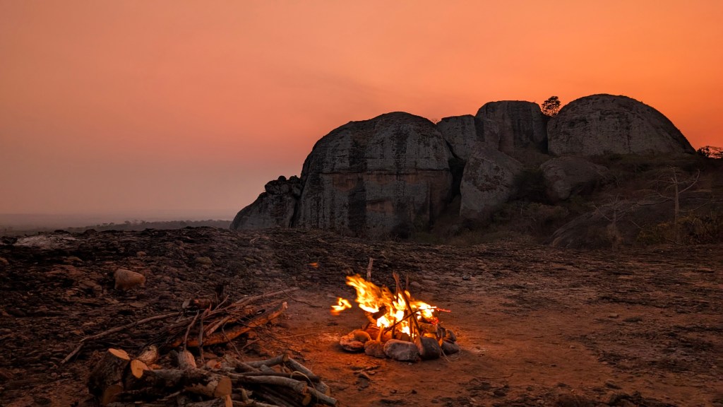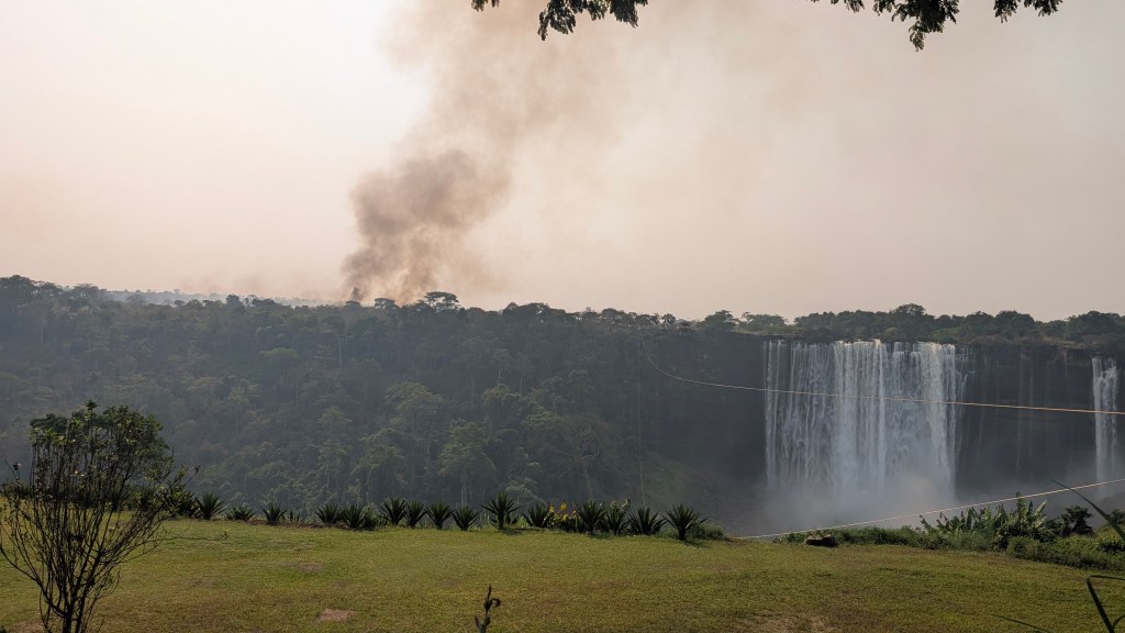 Na de beklimming pakken we de auto in en rijden we naar de calandula falls. Onderweg komen we een van de ergste vuren tegen die we tot nu toe hebben gezien. Sowieso zijn de branden in Angola echt bizar, we zien ze vrijwel elke dag en zijn ontzettend groot. Er is nauwelijks controle of bestrijding en sommige branden komen angstaanjagend dichtbij dorpen. Ook in de nacht wanneer we wild kamperen zien we in de lucht aan de horizon oranje vlekken waar er nog branden woeden.