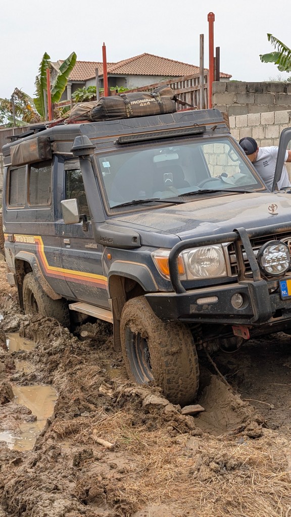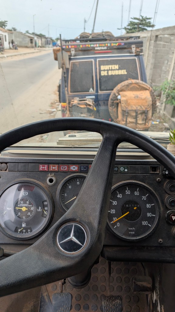 We rijden door richting de kust en zien bij een politiestop nog Sandra, die we eerder in Kameroen ook hebben ontmoet bij de Chutes de Lobé. We kletsen even en rijden vervolgens verder om Nicci & Sandro te gaan redden. Ze hebben een probleem met de auto en hebben een specifiek unimog onderdeel nodig. Iris heeft hun contactgegevens doorgegeven aan ons in Cabinda en zo gaan wij op reddingsmissie.