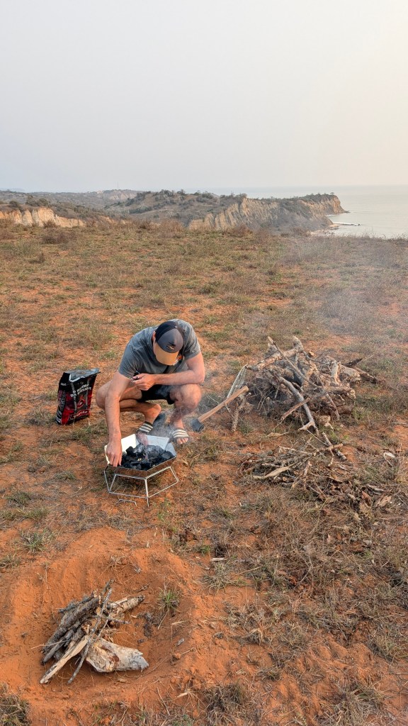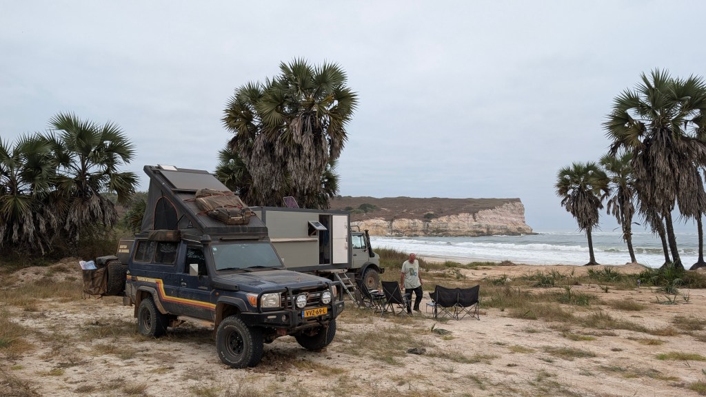 We maken een vuurtje en braaien die avond heerlijk vlees dat we hebben gekocht in Luanda, helaas hebben we de kleine BBQ nog niet helemaal onder de knie en is het eten een beetje verbrand. Maar het was wel gezellig! Omdat ik bang ben dat de klif in zal storten zetten we de auto in het donker toch een stukje verder van de klif af…. Nu kan ik in ieder geval met een gerust hart slapen.