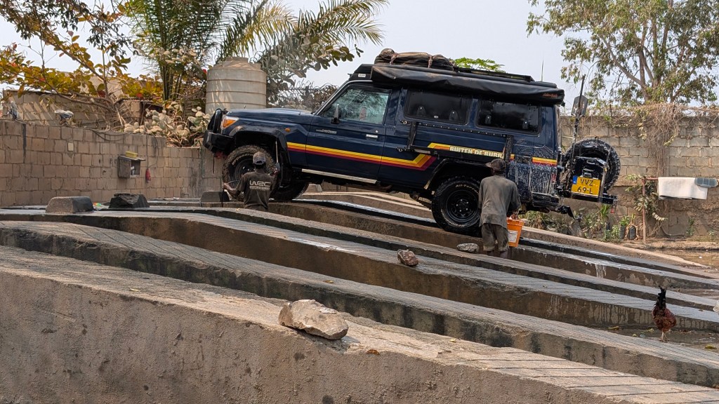 Als we aankomen bij Luis komen we voor de deur vast te zitten in ontzettend dikke modder. Gelukkig is daar de Unimog om ons eruit te trekken! Toch fijn zo’n lier. Na een kennismaking met Luis gaan we iets verderop de auto laten wassen. Helemaal shiny komen we terug en eten we bij de Kakuakos Lodge van Luis. Een heerlijke plek om tot rust te komen en te kamperen, midden in de stad.