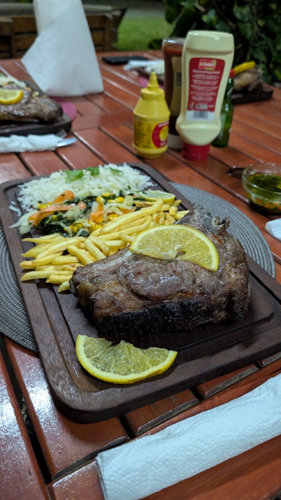 We besluiten nog een dag bij Luis te blijven om van alles en nog wat te regelen. In de avond eten we samen met Nicci & Sandro en Luis zelf een enorme T-bone steak per persoon. In Angola zijn ze in ieder geval goed met vlees.