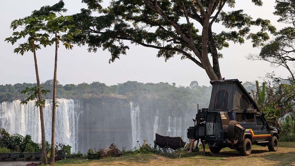 Tijd om te vertrekken. Tegenwoordig mag je maar 30 dagen visumvrij in Angola blijven en dus hebben we beperkt de tijd. We besluiten naar het zuiden te rijden richting Lobito & Benguela maar dit is niet in een dag te halen. We proberen zelf met satellietbeelden op Google maps een wild kampeer plek te vinden bij de Binga waterval. We vinden uiteindelijk een prachtige en rustige plek op de berg met uitzicht over de vallei. We horen de geluiden van beneden maar zijn volledig onzichtbaar voor de bewoners van de stad.