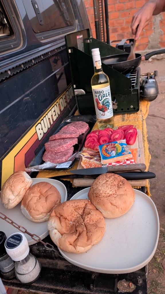 Na de gap gaan we terug Lubango in en doen we boodschappen. Tijdens de boodschappen worden we geholpen door een Zuid-Afrikaan die Portugees spreekt, dit blijkt een eigenaar van een restaurant en tevens bij zich thuis een kampeerplek aanbiedt. Behalve dat hij ons hielp met vertalen vonden we het niet de gezelligste man. (hij maakte ook nog de fout toen ik zei hamburgers van 150/200 gram om burgers van 280 gram per stuk te bestellen).