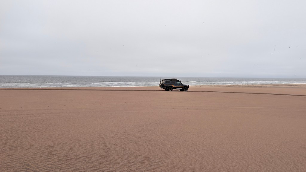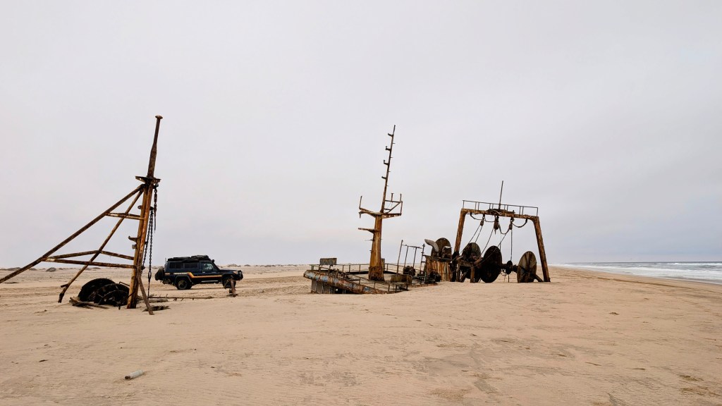 Na de arch gaan we naar Tombua om te tanken en besluiten gelijk om de duinen langs de atlantische oceaan in te rijden. In dit ruige gebied waar vrijwel altijd mist hangt, hangt een grimmige sfeer. Er liggen scheepswrakken en dode zeeleeuwen en walvissen langs de kust en de zon krijgt amper een kans om door de wolken te breken. Het waait hier ook nog enorm en er is verder geen levend wezen.