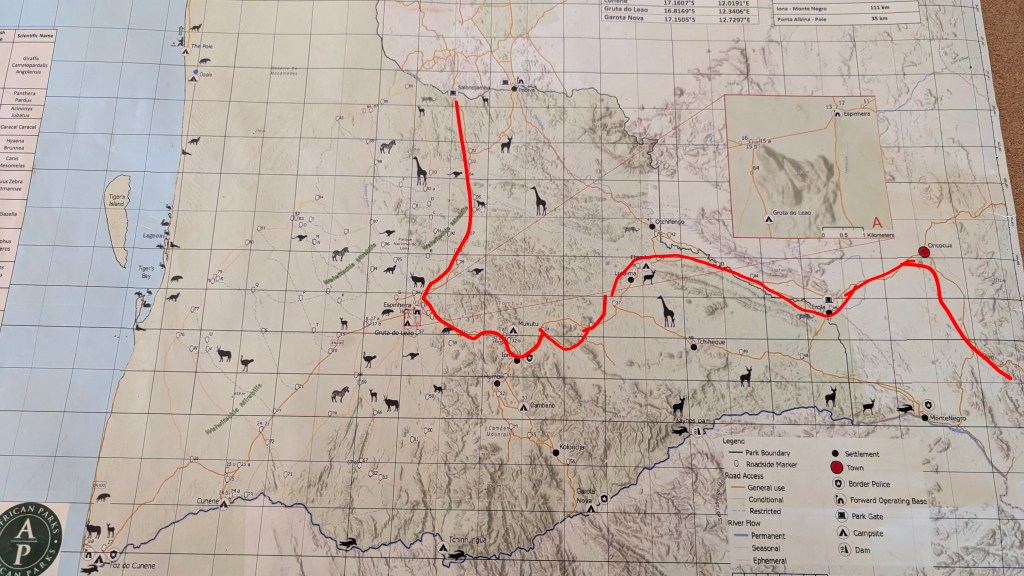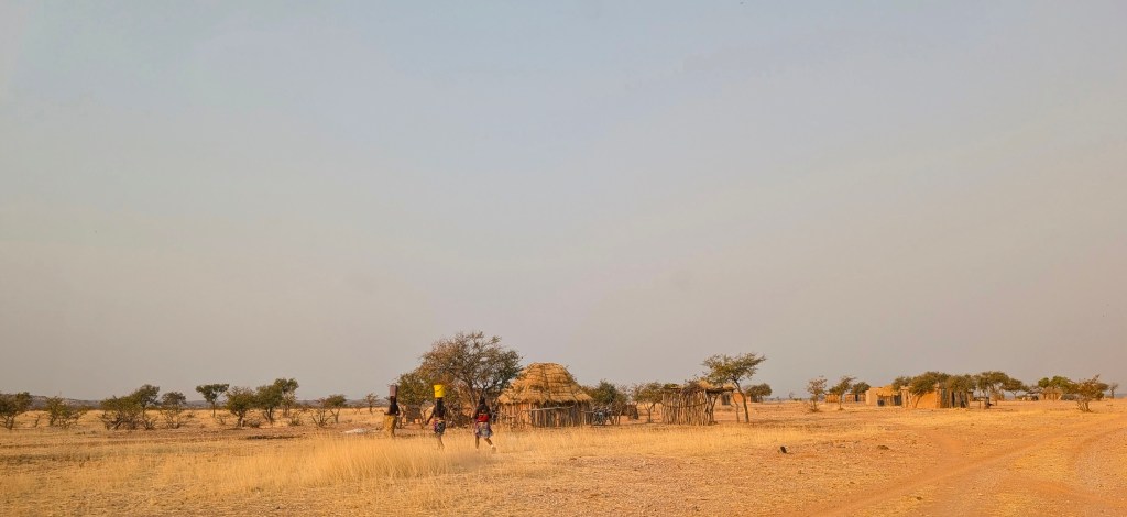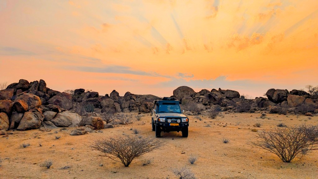 Net voor zonsondergang rijden we het park uit maar nu nog een slaapplek vinden. Het is hier veel meer bevolkt dan we hadden verwacht, overal zijn kleine Himba dorpen en we willen niet per ongeluk om iemand terrein staan. Gelukkig vinden we net voor het donker wordt een goede plek. Behalve wat vee dat op weg is naar huis (zonder herder) zien we niemand.