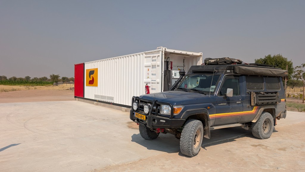 We eten een gekookt eitje en rijden weer verder. Alle tankstations voor de grens met Namibië die op google en ioverlander stonden zijn dicht of verdwenen. Superbalen…. We besluiten dan maar de grens over te steken en in Namibië te tanken. En dan opeens een paar honderd meter voor de grens: een volledig nieuwe container met pomp. Dit scheelt ons minstens 150 euro aan benzine.